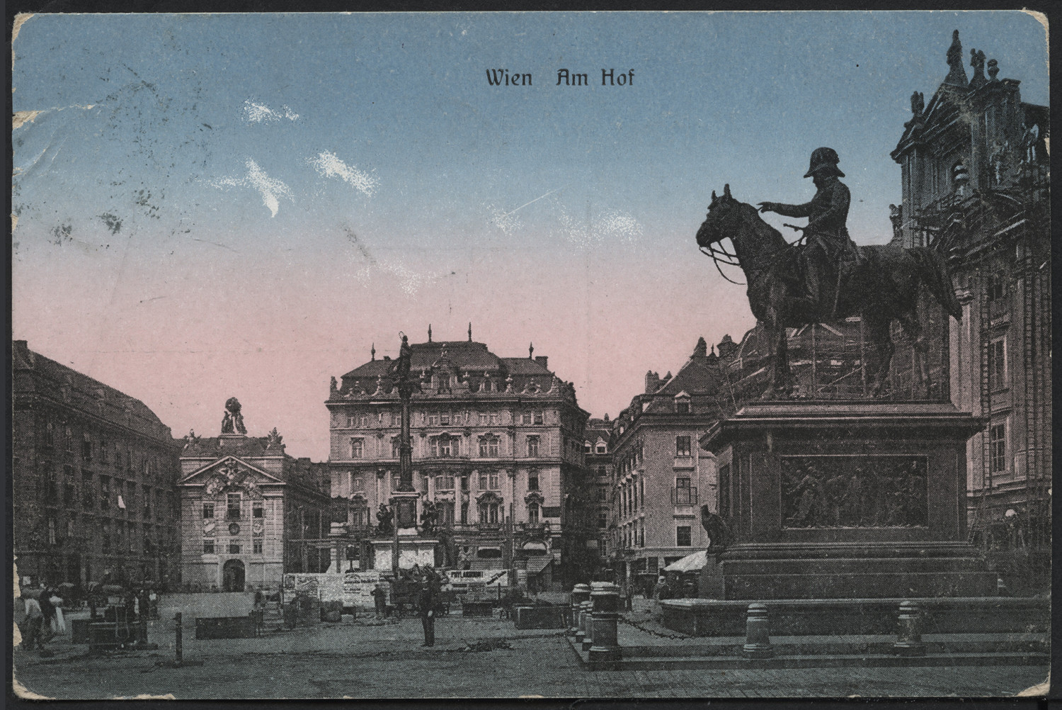 Nazwa: Wiedeń, data: ok. 1908, miejsce: , typ obiektu: , wymiary9,1 x 13,9, opis: Widokówka, Wiedeń, plac Am Hof: kościół, kamienice, pomniki; reprod. fot. druk cz.-b. kolorowany; odwr.: czarny nadr. poczt., firm., koresp. odręcz. atram. znaczek austr., stempel