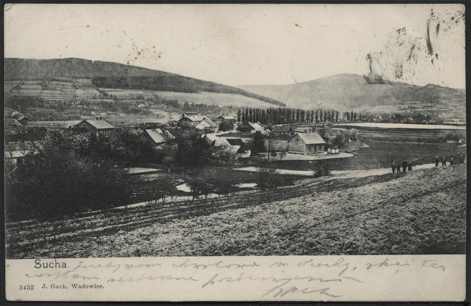 Nazwa: Sucha Beskidzka, pejzaż, data: pocz. XX w., miejsce: , typ obiektu: , wymiary9,0 x 14,0, opis: pejzaż wiejski, reprod. fot. druk cz.-b.; odwr.: nadr. poczt., firm., koresp. odręcz. ołówkiem znaczek austr., stempel