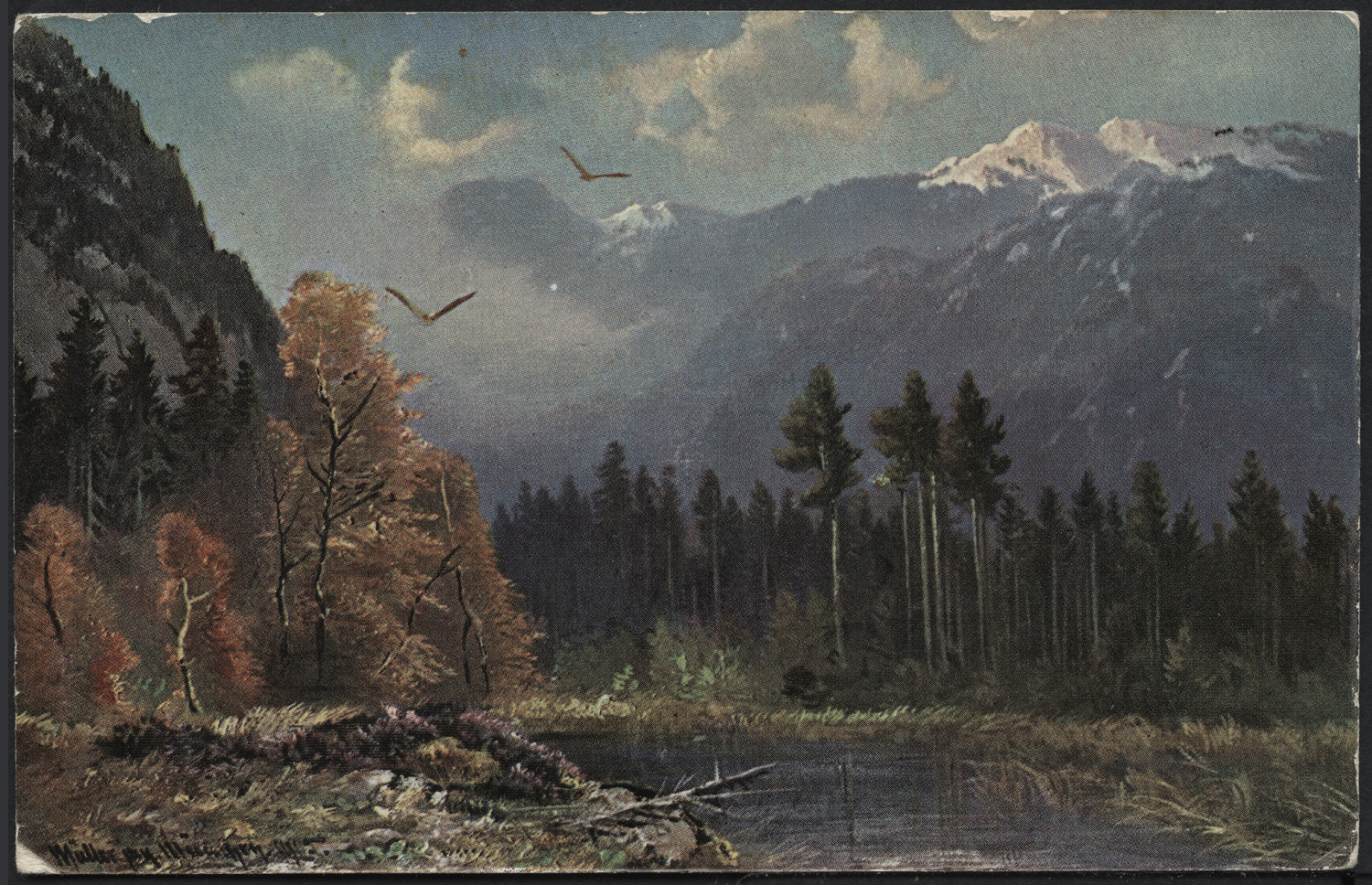 Nazwa: Reprodukcja malarstwa, pejzaż leśny, data: ok. 1906, miejsce: , typ obiektu: , wymiary8,9 x 13,9, opis: pejzaż, reprod. mal.; odwr.: zielony nadr. poczt., firm., koresp. odręcz. atramentem