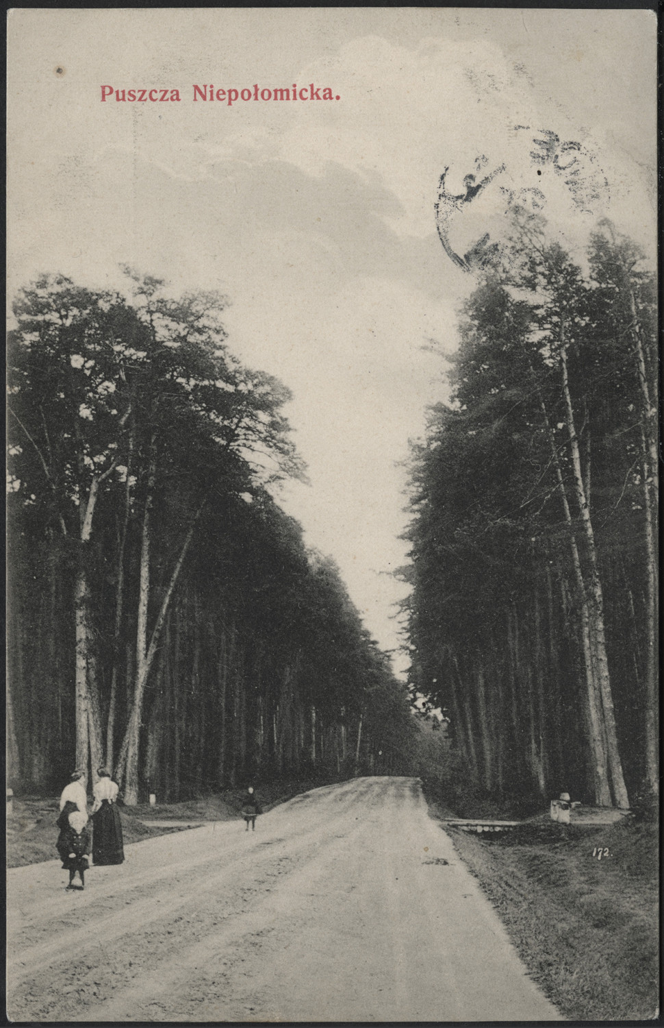 Nazwa: Puszcza Niepołomicka, pejzaż, data: ok. 1906, miejsce: , typ obiektu: , wymiary13,9 x 9,0, opis: pejzaż, droga przez las, po l. 2 kobiety i dziecko; reprod. fot., druk cz.-b.; odwr.: ziel. nadr. poczt., firm., koresp. odręcz. atramentem, znaczek austr., 2 stemple: Borzęcin, Niepołomice