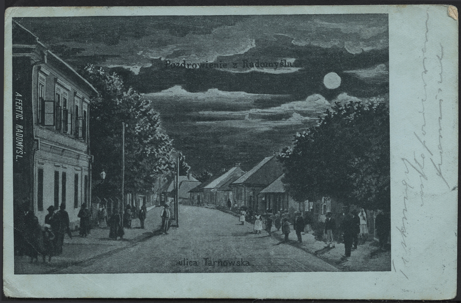 Nazwa: Ulica Radomyśla nocą, Tarnów, data: ok. 1905, miejsce: , typ obiektu: , wymiary8,9 x 13,9, opis: pejzaż, Radomyśl nocą, ulica, przechodnie; druk; odwr.: czarny nadr. poczt., firm., koresp. odręcz. oł.; znaczek austr., stempel
