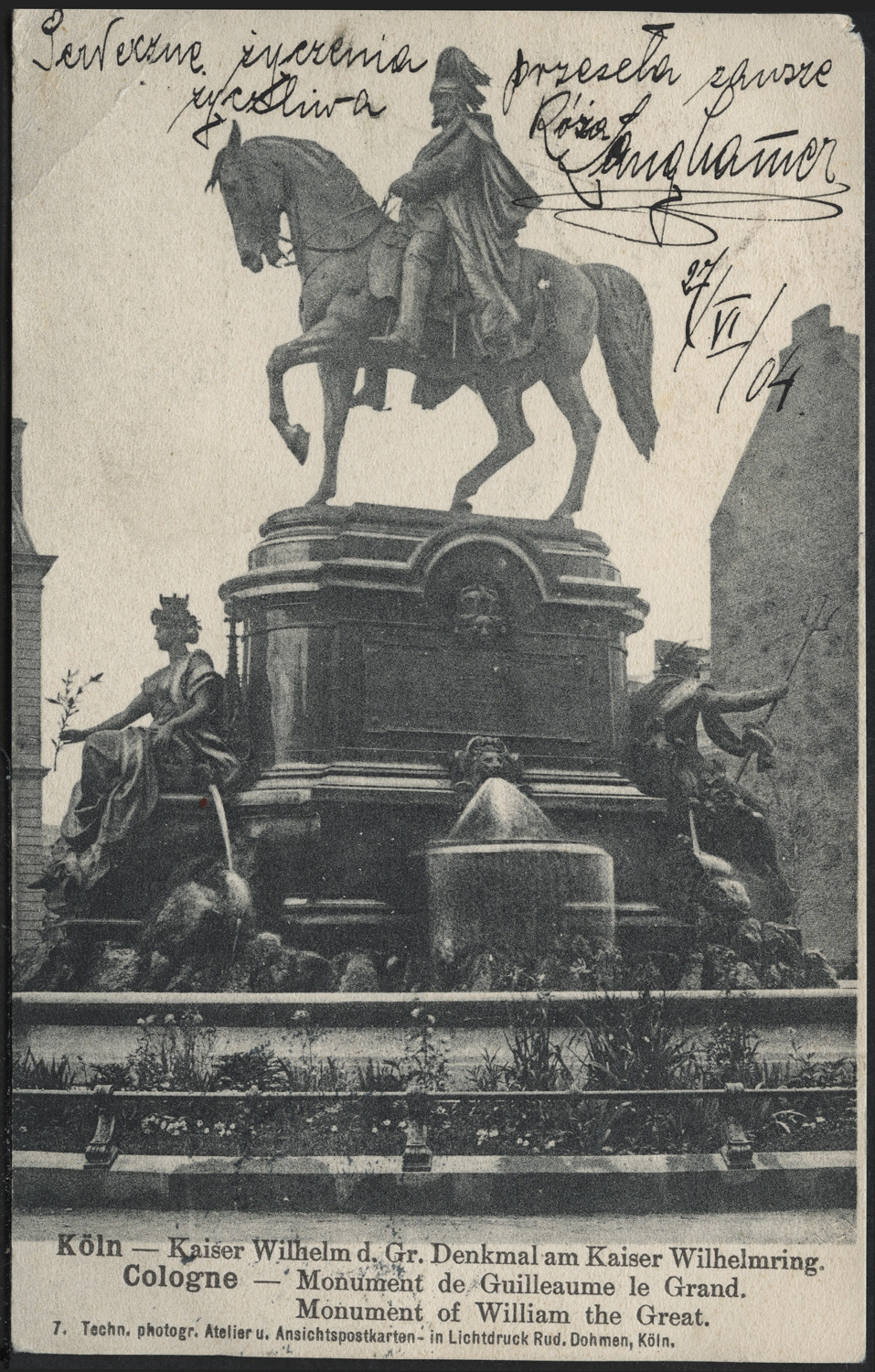 Nazwa: Kolonia, pomnik konny Wilhelma Wielkiego, data: ok. 1904, miejsce: , typ obiektu: , wymiary8,9 x 14,0, opis: widok, pomnik konny na cokole, 2 postaci alegorycz., fontanna; druk; ; odwr.: czarny nadr. poczt., firm.