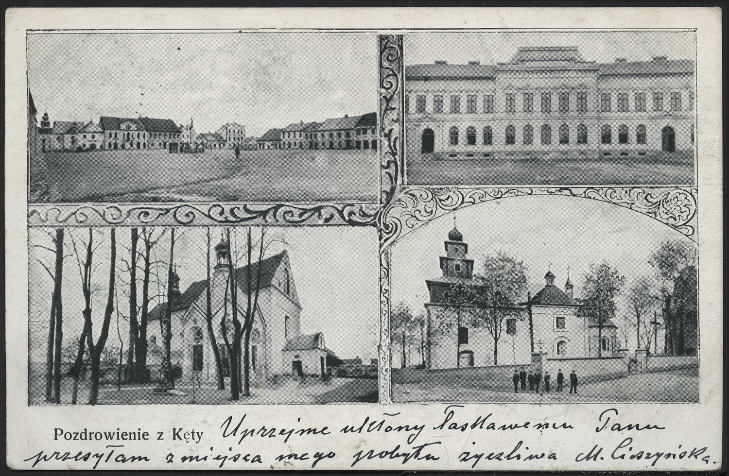 Nazwa: Kęty, cztery widoki, data: ok. 1904, miejsce: , typ obiektu: , wymiary9,0 x 13,9, opis: 4 widoki przedst. 2 kościoły, gmach i rynek z zabytkowymi domami, druk; odwr.: czarny nadr. poczt., firm.; koresp. odręcz.; stempel