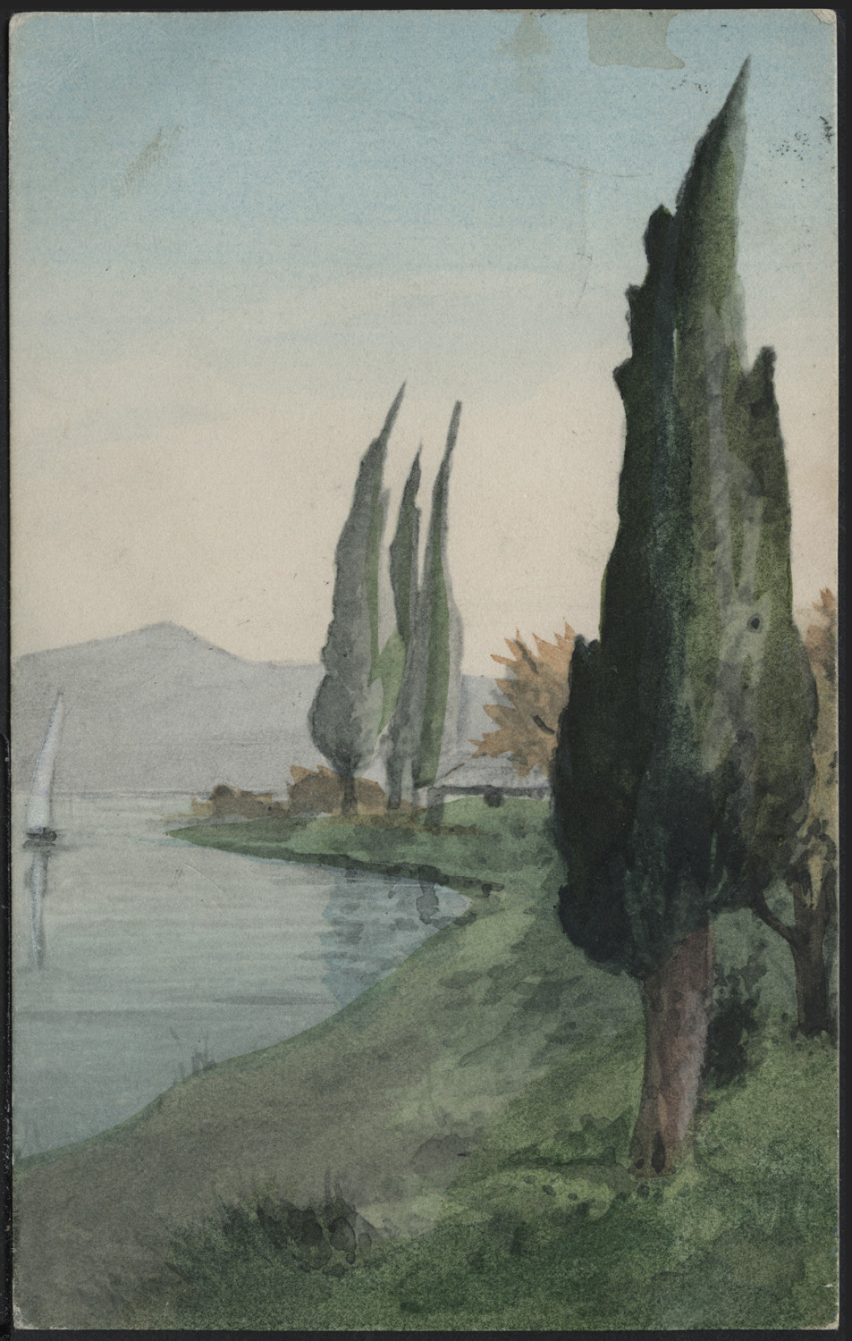 Nazwa: Cyprysy nad zatoką, pejzaż, data: ok. 1906, miejsce: , typ obiektu: , wymiary8,7 x 13,9, opis: widok nadmorski z żaglówką, cyprysy, góry w tle, druk; odwr.: brązowy nadr. poczt., firm.; koresp. odręcz.; znaczek austr., stempel prost. z zaokr. rogami: Stryj 06