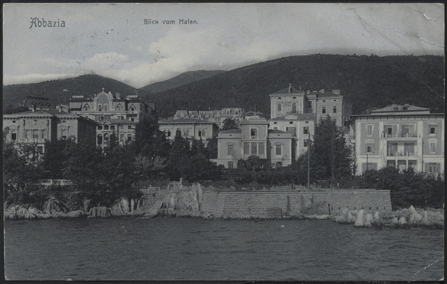 Nazwa: Wybrzeże z willami, data: ok. 1906, miejsce: , typ obiektu: , wymiary8,8 x 13,9, opis: widok, Abacja, morze, na wprost wille, ogrody, góry; druk; odwr.: czarny nadr. poczt., firm.; koresp. odręcz.