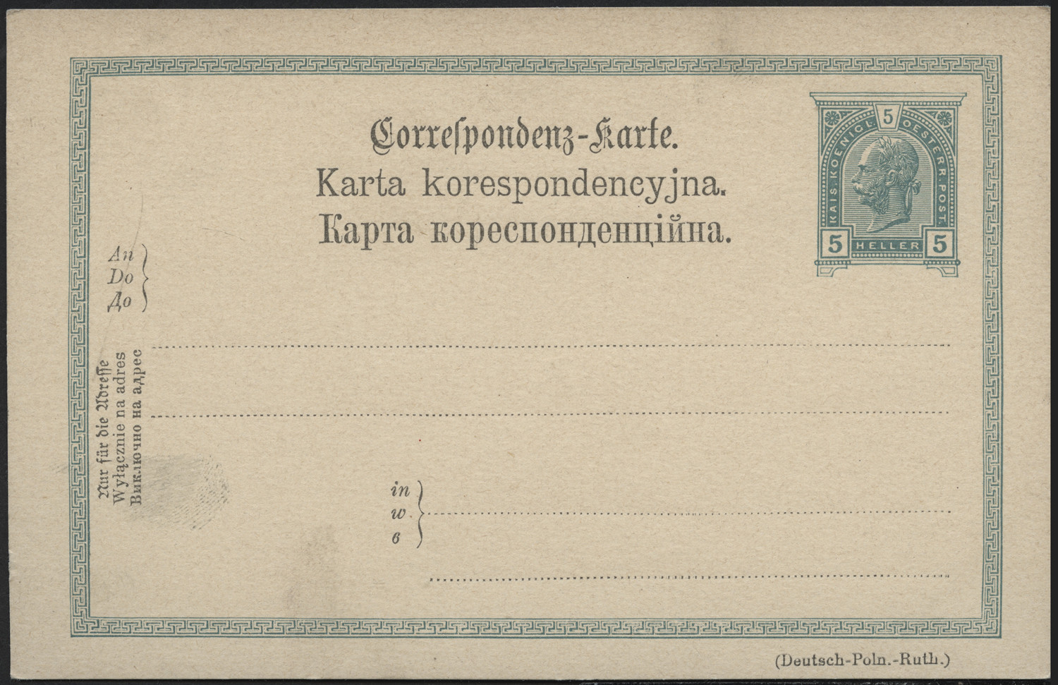 Nazwa: Zielony nadruk pocztówkowy, data: pocz. XX w., miejsce: , typ obiektu: , wymiary9,0 x 14,0, opis: karta korespondencyjna druk kol. zielony; miejsce na adres, nadr. w j. niem. i fr., wokół ozdobny szlak z meandrem i nadrukowany znaczek austr.