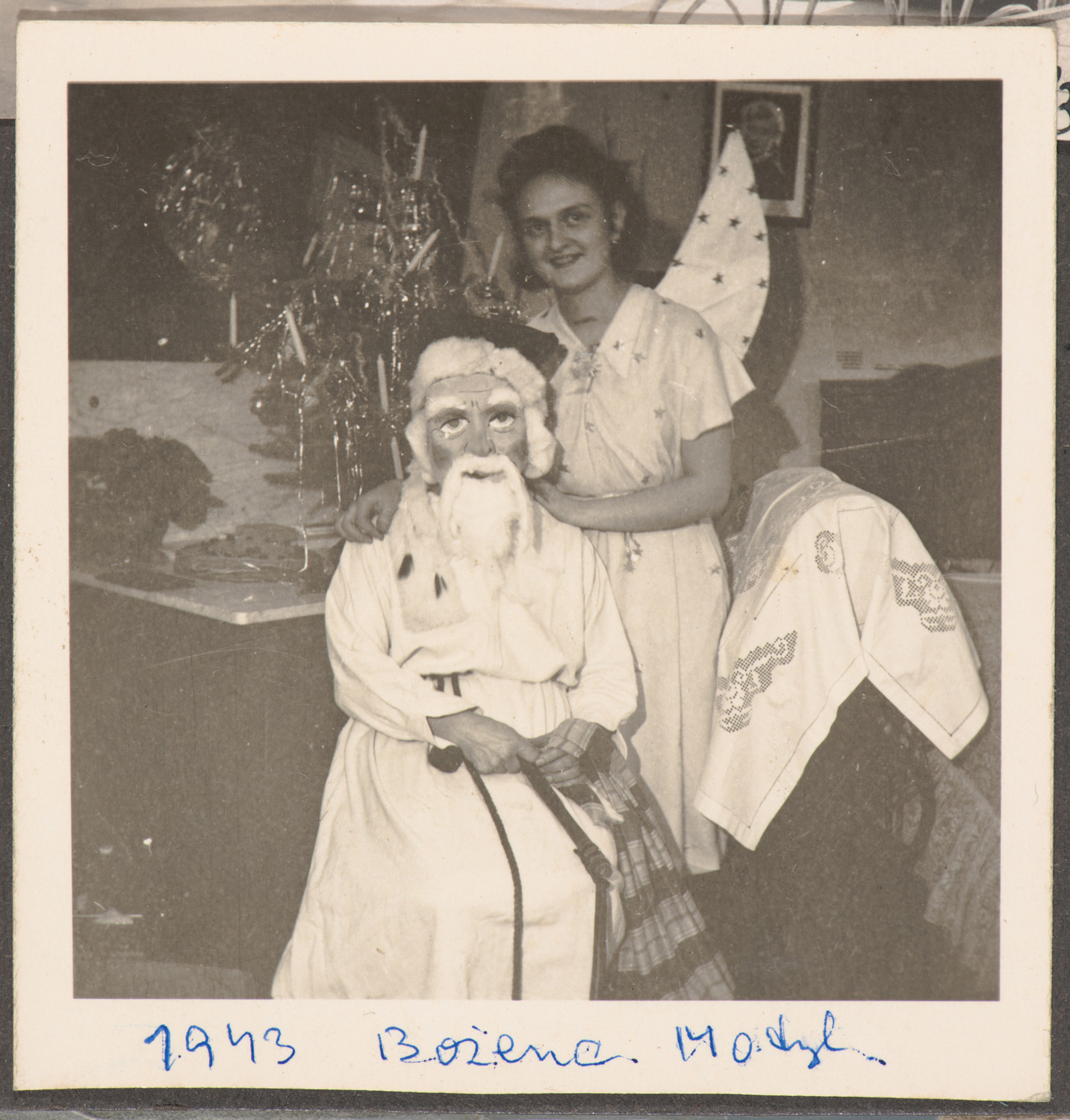 Nazwa: Boże Narodzenie, data: 1943 r., miejsce: , typ obiektu: , wymiary6,2 x 6,1, opis: Dziewczyna (Bożena Motylewska) w stroju anioła i Święty Mikołaj, upozowani przy choince.