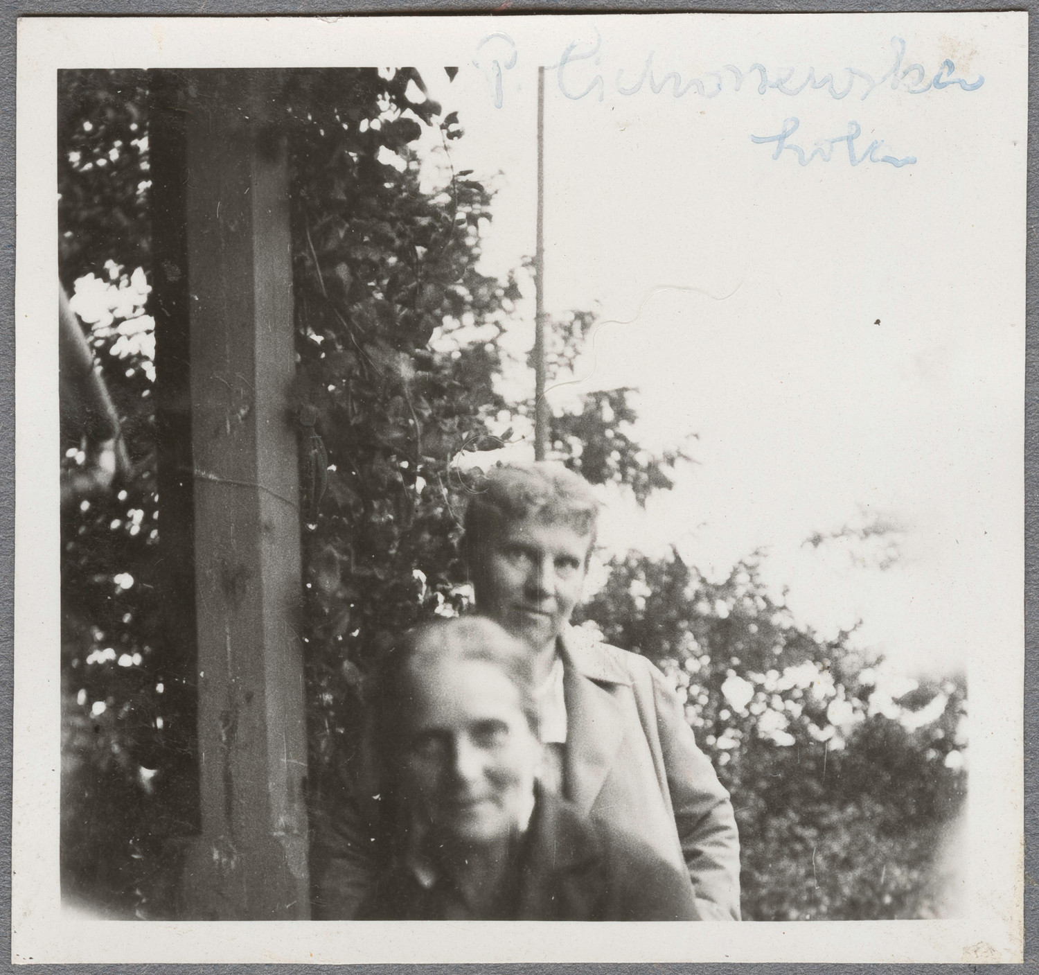 Nazwa: Karola Karyłowska i p. Cichorzewska, portret w plenerze, data: l. 30. XX w., miejsce: , typ obiektu: , wymiary5,5 x 5,8, opis: dwie kobiety ujęcie w popiersiu, jedna za drugą, na wprost, po lewej filar ganku
