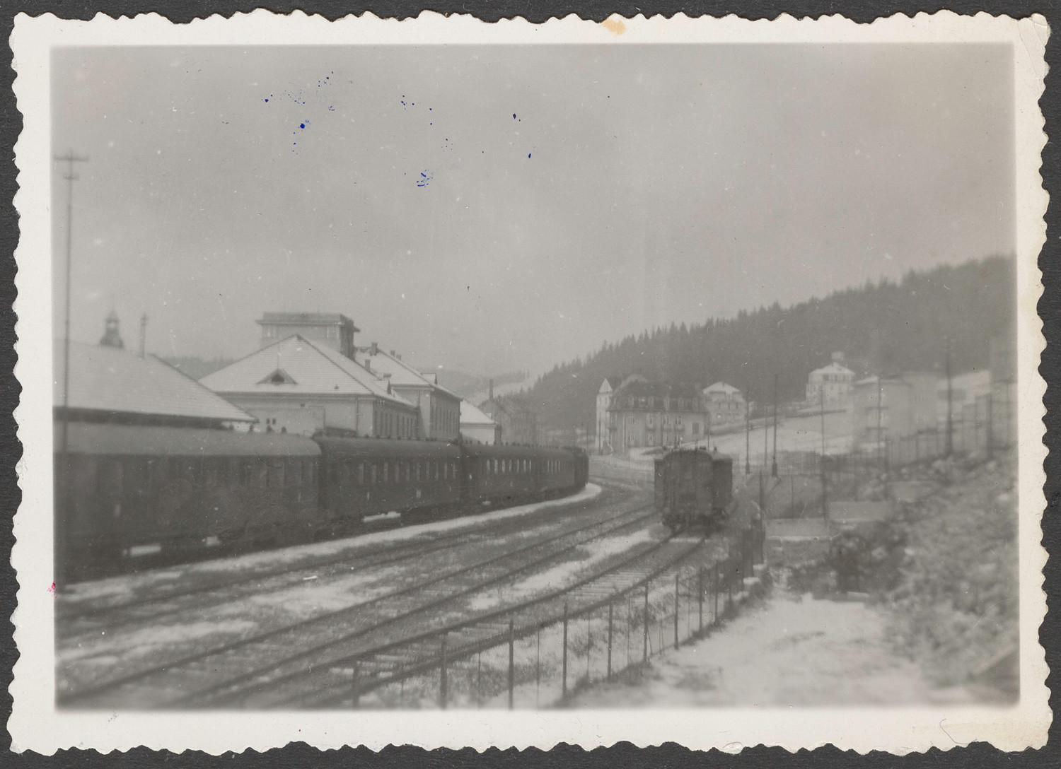 Nazwa: Tory kolejowe., data: l. 30. XX w., miejsce: , typ obiektu: , wymiary6,2 x 8,6, opis: widok torów kolejowych, po lewej pociąg na torach, po prawej pojedynczy wagon, ziemia przysypana śniegiem