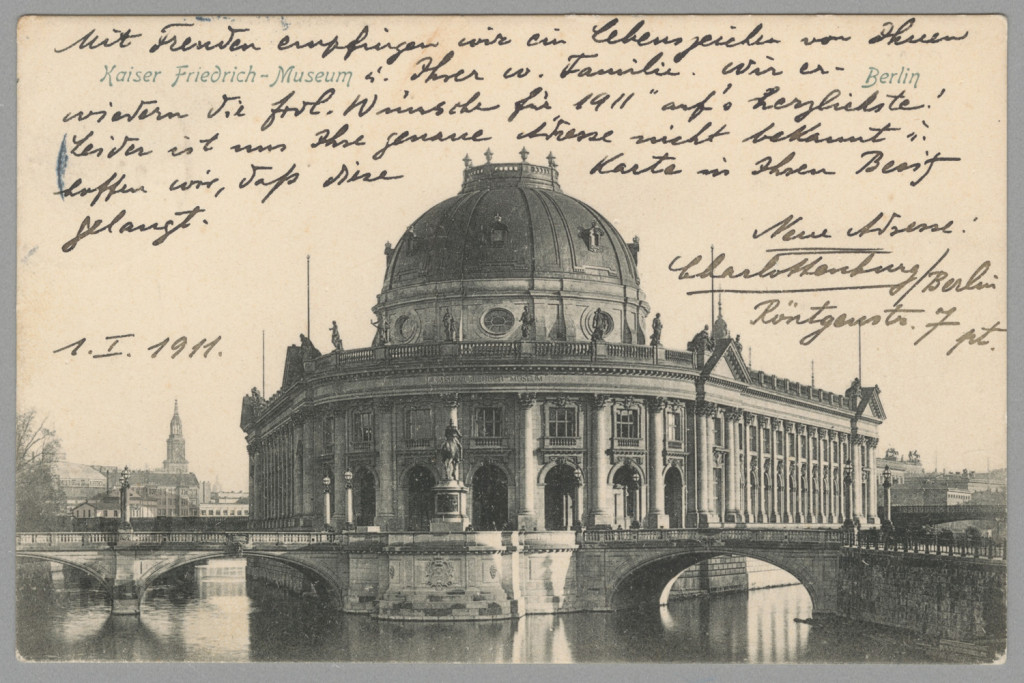 Nazwa: Berlin, muzeum, data: 1 poł. XX w., miejsce: , typ obiektu: , wymiary9 x 14, opis: karta pocztowa repr. druk wg fot., cz.-b. ; na g.marginesie podpis w j.n. czarny druk; odwr.: druk firm. znak, odręcznie tekst koresp.; pieczęć tusz.