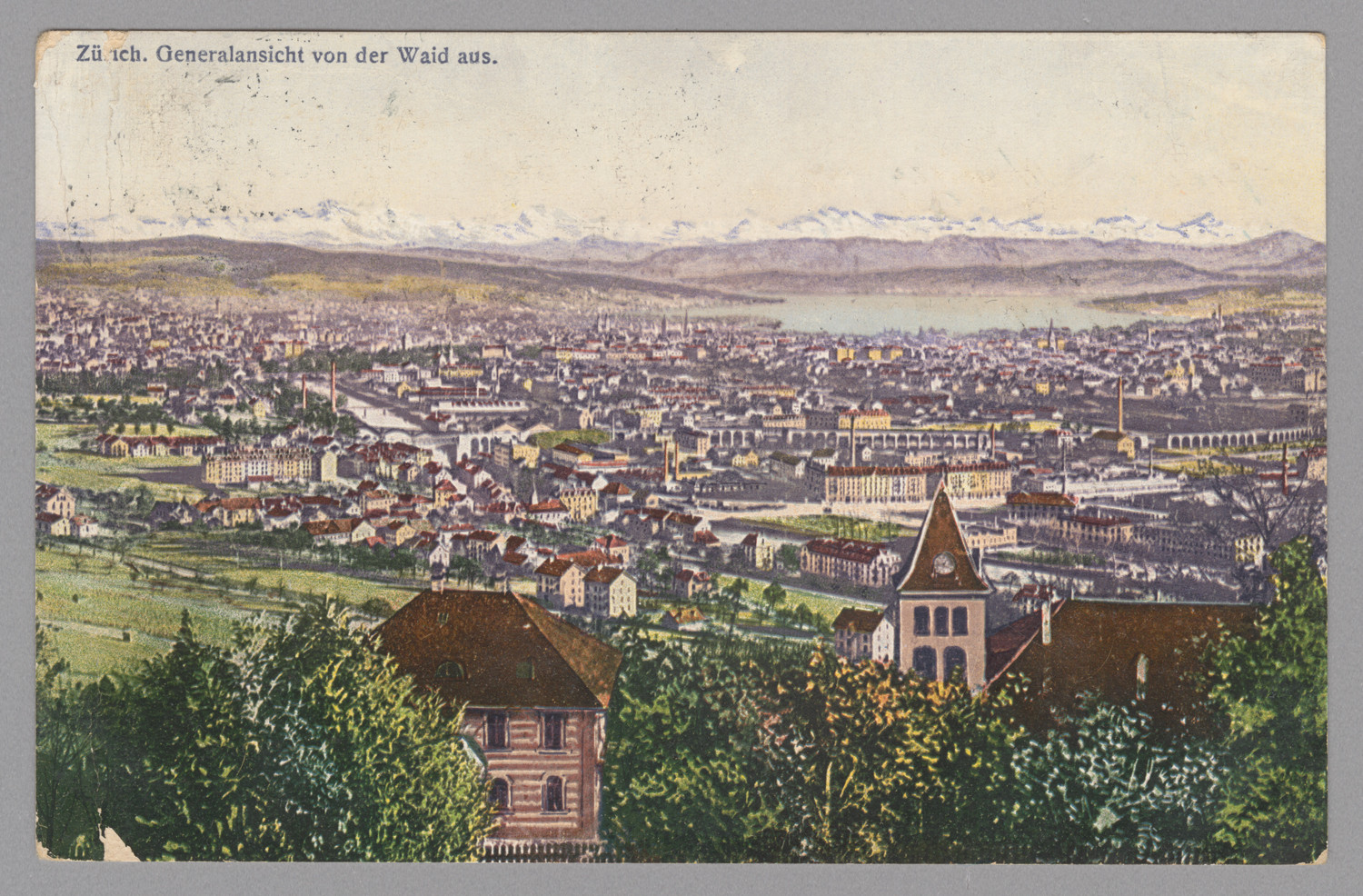 Nazwa: Zurych panorama , widok z Waid, data: 1 poł. XX w., miejsce: , typ obiektu: , wymiary9 x 14, opis: karta pocztowa reprodukcja ; krajobraz górski jez. Zuryskie rz. Limmat Zurych podpis w j.n. czarny druk; odwr.: druk firm. znak, odręcznie tekst koresp.; pieczęć tusz.