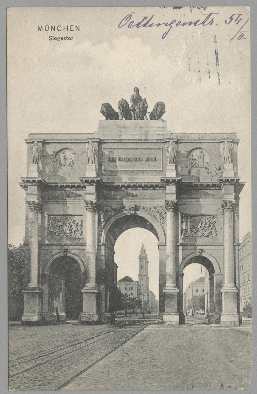 Nazwa: Monachium , brama zwycięstwa - łuk triumfalny, widok, data: 1 poł. XX w., miejsce: , typ obiektu: , wymiary9 x 14, opis: karta pocztowa reprodukcja ; Monachium brama zwycięstwa ulica fragm. miasta u g. podpis w j.n. czarny druk; odwr.: druk firm. znak, odręcznie tekst koresp.; pieczęć tusz.