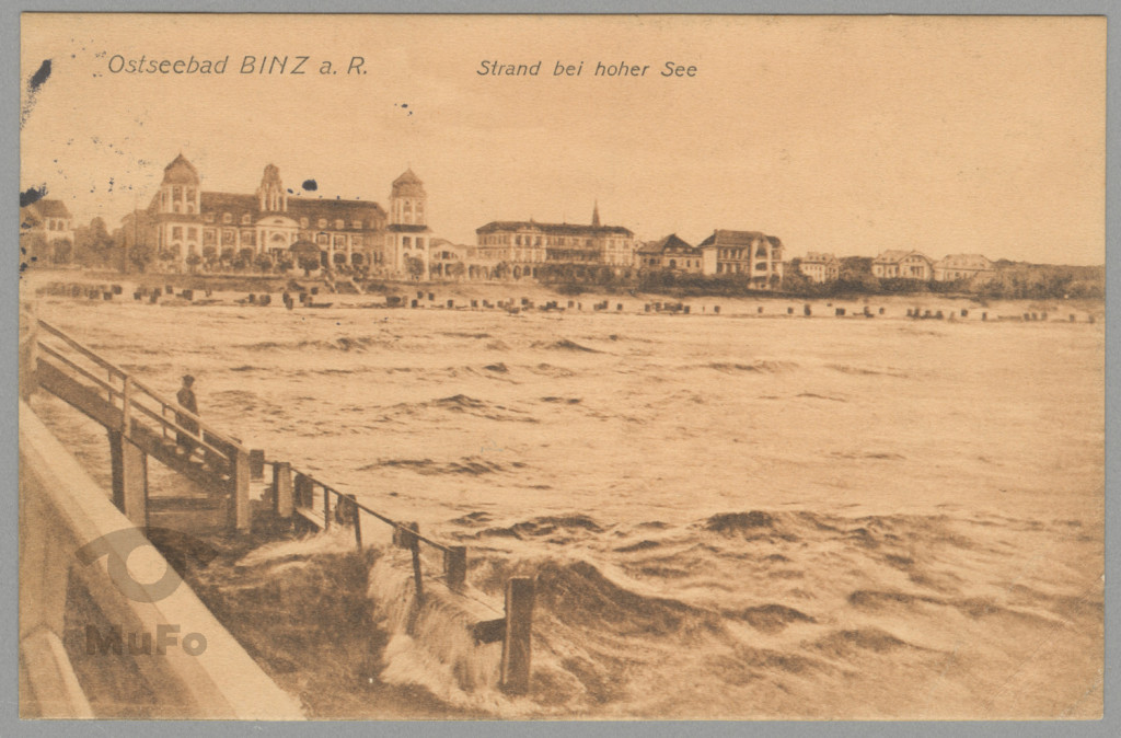 Nazwa: letnisko Binz , plaża, data: 1 poł. XX w. przed 1913, miejsce: , typ obiektu: , wymiary9 x 14, opis: karta pocztowa reprodukcja ; Binz plaża molo na g.marginesie podpis w j.n. czarny druk; odwr.: druk firm. znak, odręcznie tekst koresp.; pieczęć tusz., znaczek