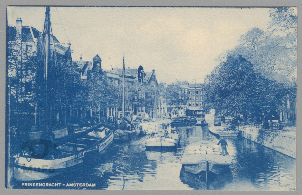 Nazwa: Amsterdam , Prinsengracht, widok kanału, data: 1 poł. XX w. przed 1913, miejsce: , typ obiektu: , wymiary8,6 x 13,7, opis: Amsterdam kanał łodzie i barki frag, miasta ; na g. podpis czarny druk; odwr.: druk firm., odręcznie tekst koresp.; pieczęć tusz.