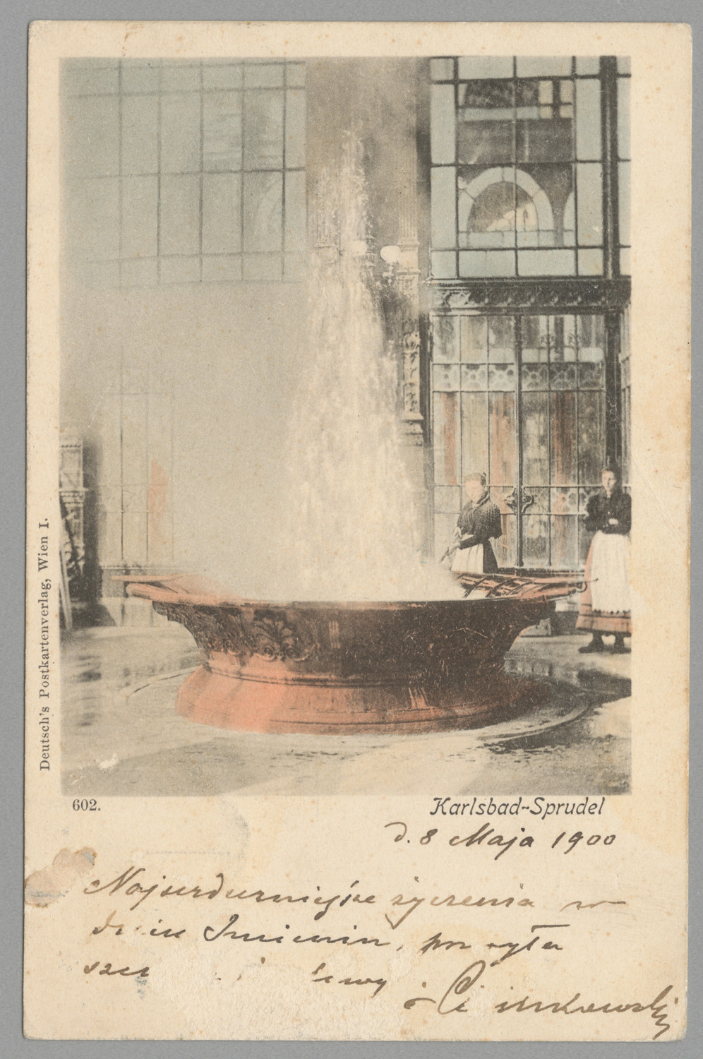 Nazwa: Karlsbad ( Karlowe Wary ) wnętrze bud. sanatoryjnych - gorące źródło, data: pocz. XX w. przed 1900, miejsce: , typ obiektu: , wymiary9 x 13,5, opis: karta pocztowa reprod. cz.-b. barw. ręcznie; wnetrze sanatorium gorące źródło obok 2. kobiety w fartuchach; podpis w j.n. czarny druk; odwr.: druk firm. znak, odręcznie tekst koresp.; pieczęć tusz.