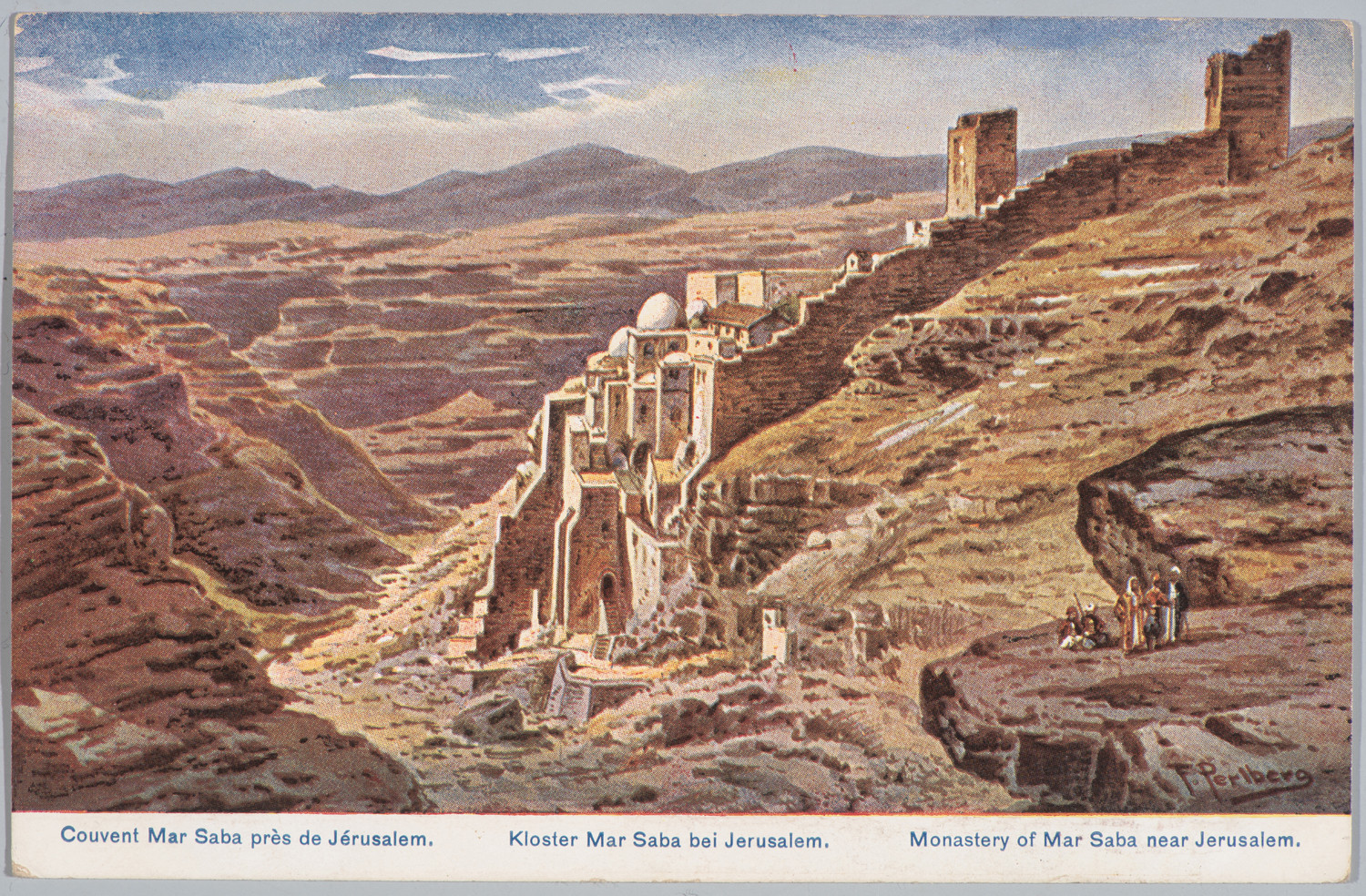 Nazwa: repr. mal. F. Perlberg: Jerozolima klasztor Mar Saba, data: 1 poł. XX w., miejsce: , typ obiektu: , wymiary9 x 14, opis: Jerozolima klasztor na d.marginesie podp. w j.niem,fr,ang.błękitny druk; odwr.:brąz. druk firm. znak: Ca&Co, odr.nap.; pieczęć tusz.