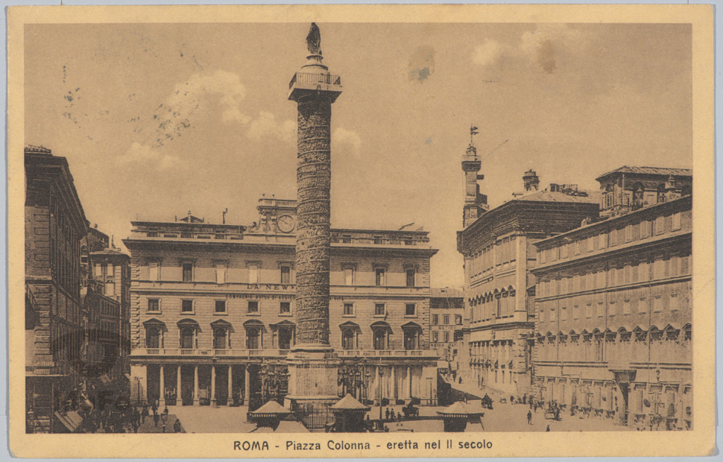 Nazwa: widok, Rzym, Piazza Colonna, data: przed 1912, miejsce: , typ obiektu: , wymiary9 x 14, opis: karta pocztowa reprodukcja wg fot. ; Rzym widok plac kolumna Trajana szyld Tow. ubezpieczeń; na d.marginesie podpis w j.wł. czarny druk; odwr.: druk odręcznie tekst koresp.; pieczęć tusz., datownik