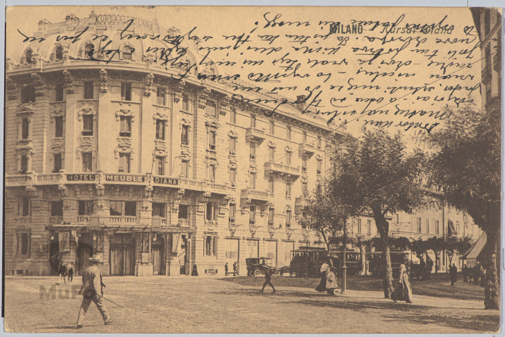 Nazwa: Mediolan hotel Diana, ulica, data: pocz. XX w., miejsce: , typ obiektu: , wymiary9 x 14, opis: karta pocztowa reprodukcja ; Mediolan hotel fragm. ulicy ; u g. podpis druk. odwr.: druk brąz. pap. żółty; odręcznie tekst koresp.; pieczęć tusz., stempel