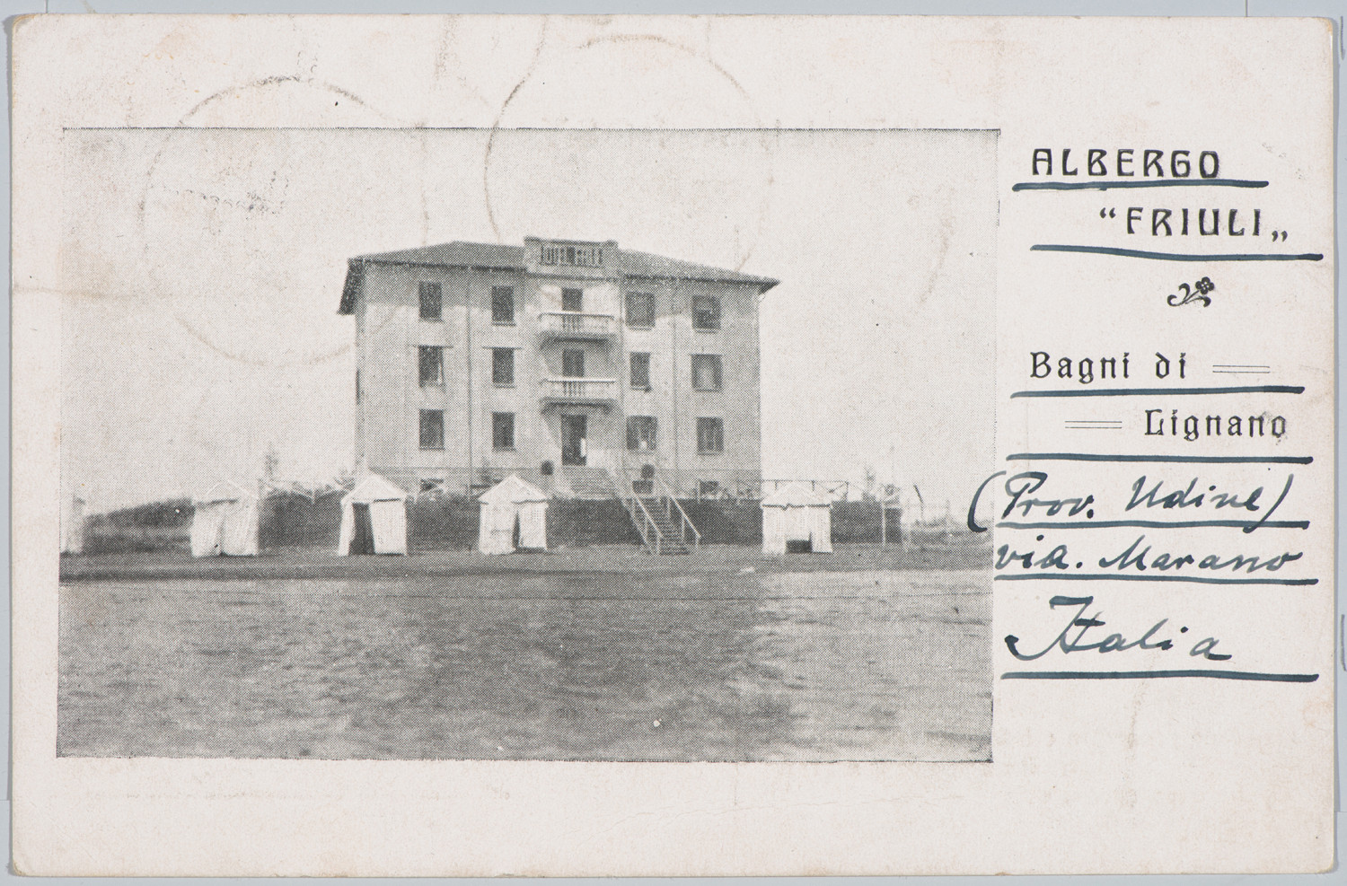Nazwa: Lignano ( Udine ) kąpielisko hotel, data: 1 poł. XX w. przed 1914, miejsce: , typ obiektu: , wymiary9 x 14, opis: karta pocztowa reprodukcja druk cz.-b. : kapielisko, budynek hotelu n. morzem; na marginesie podpis w j. czarny druk; odwr.: druk firm. znak, odręcznie tekst koresp.; pieczęć tusz.