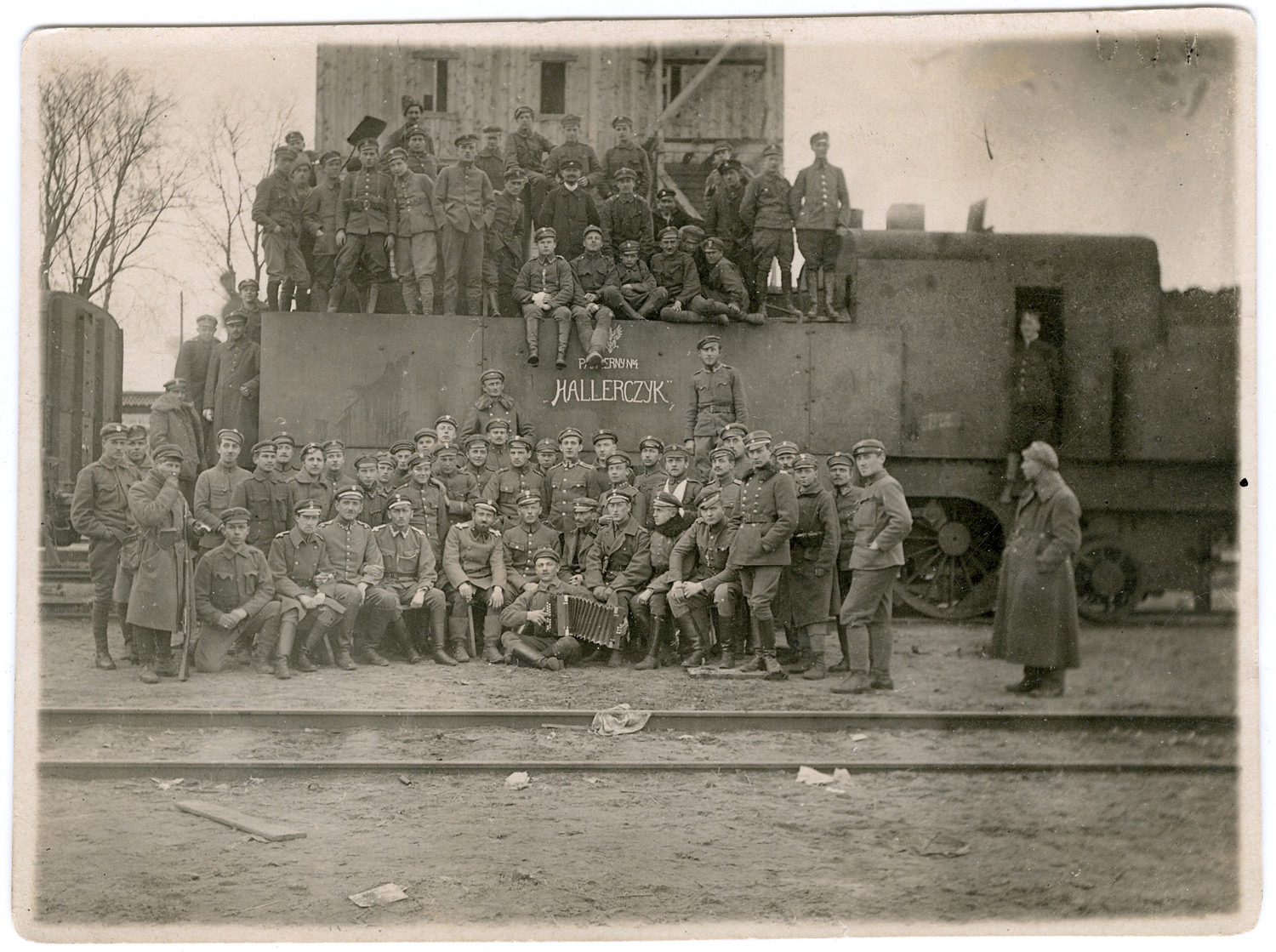 Nazwa: załoga pociągu pancernego "Hallerczyk", data: ok. 1919, miejsce: , typ obiektu: , wymiary8,4 x 11,3, opis: Grupa Hallerczyków pozująca przy parowozie pociągu pancernego. Żołnierze w charakterystycznych mundurach legionowych. Na pancerzu parowozu emblemat orła i napis: " PANCERNY No4/ HALLERCZYK" W tle zabudowania dworca.