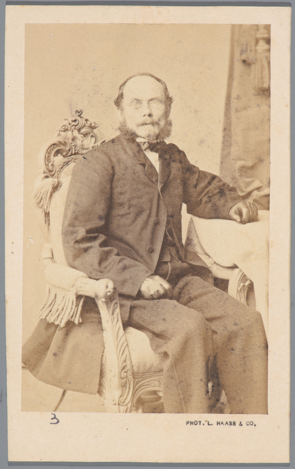 Nazwa: mężczyzna, portr. ( kupiec Kaniewski z Poznania ),, data: ok. 1870 - 85, miejsce: , typ obiektu: , wymiary9,7 x 6,1, opis: mężczyzna w średnim wieku, niemal cała postać, widać wyposażenie atelier; naklejona na tekt. firm., z nadr. firm. i winietą rekl. na odwrociu; adnotacja na karcie alb..