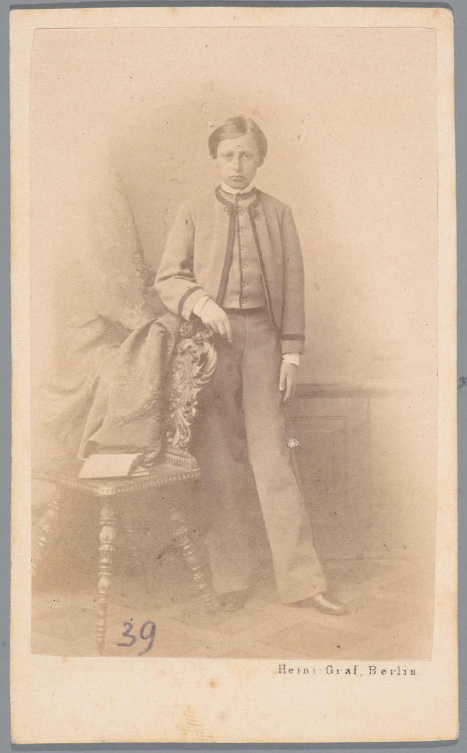 Nazwa: Stefan Łącki w w. 16-17 l., portret atelierowy, data: ok. 1863-64, miejsce: , typ obiektu: , wymiary10 x 6, opis: chłopiec ok. 16 l. cała postać, widać wyposażenie atelier; naklejona na tekt. firm., z nadr. firm. i winietą rekl. na odwrociu.