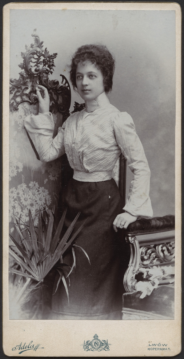 Nazwa: portret kobiety, data: 1902, miejsce: , typ obiektu: , wymiary14,8 x 7,5, opis: Młoda kobieta, ujecie do kolan, stoi wspierając sie ręką na oparciu fotela. Fot. formatu amerykańskiego.