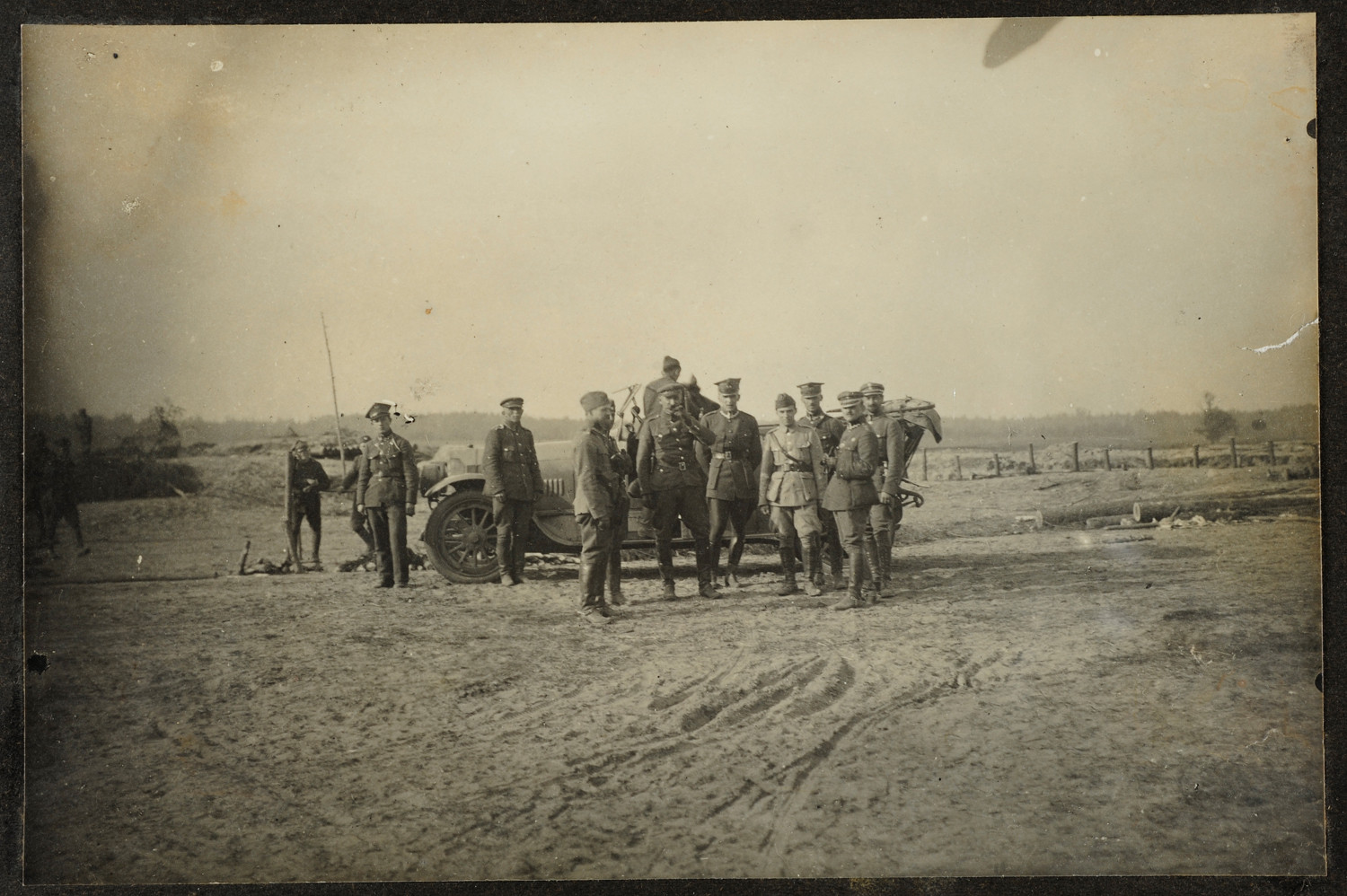 Nazwa: Oficerowie WP przy samochodzie, data: 1919, miejsce: , typ obiektu: , wymiary10,5 x 15,8, opis: Grupa oficerów Wojska Polskiego stoi przed samochodem.