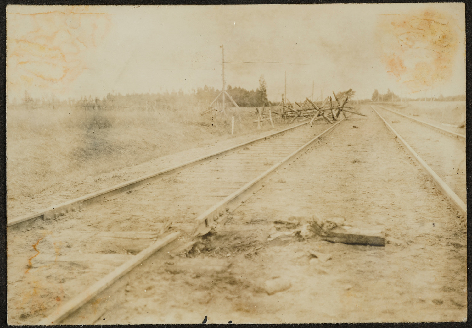 Nazwa: Zasieki na torach kolejowych, data: 1919, miejsce: , typ obiektu: , wymiary9,0 x 12,8, opis: Linia kolejowa, dwutorowa. Lewe tory przegrodzone zasiekami. Na pierwszym planie uszkodzony jeden tor. Ślad po wybuchu i zerwaniu ciągłości toru.