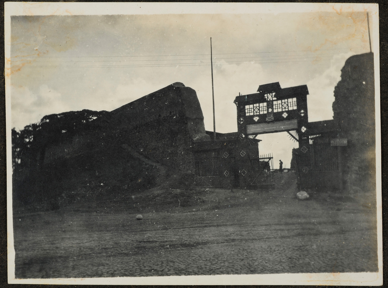 Nazwa: Brama na dziedziniec zamku w Lidzie., data: 1919, miejsce: , typ obiektu: , wymiary7,8 x 10,4, opis: Drewniana brama na dziedziniec zamku w Lidzie i fragment muru obwodowego zamku.