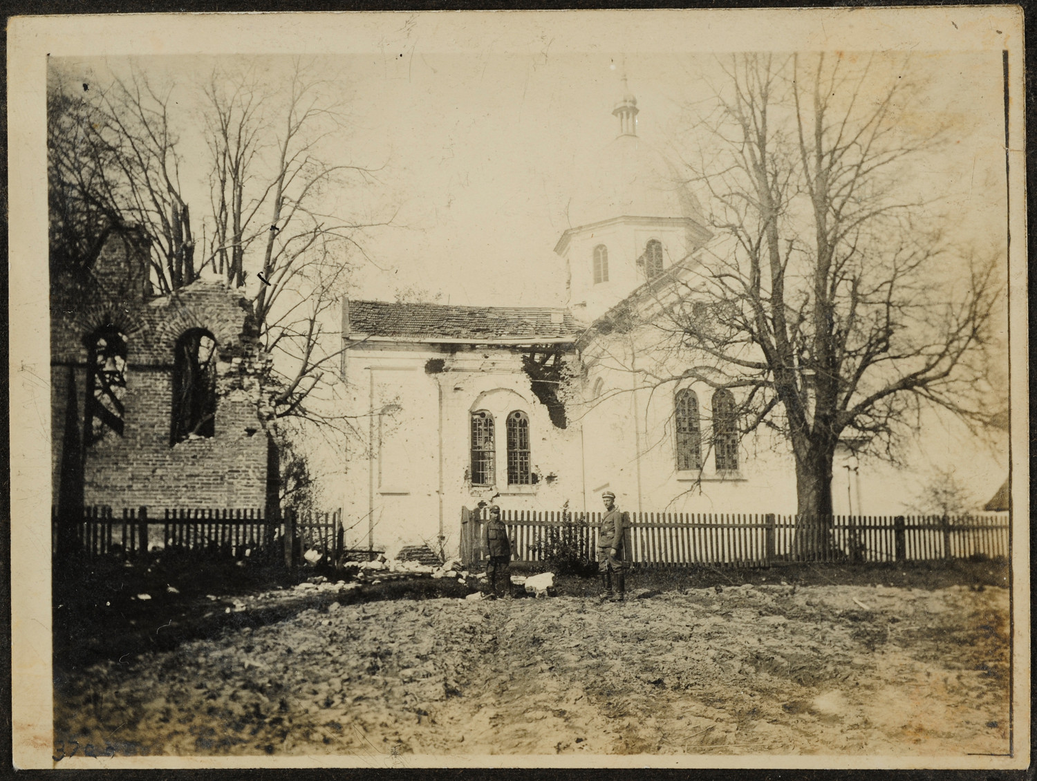 Nazwa: Kościół, data: 1919, miejsce: , typ obiektu: , wymiary8,8 x 11,7, opis: Koścół jednonawowy z transeptem. Po lewej stronie widoczna ceglana dzwonnica. Przed swiątynia dwaj żołnierze Wojska Polskiego.