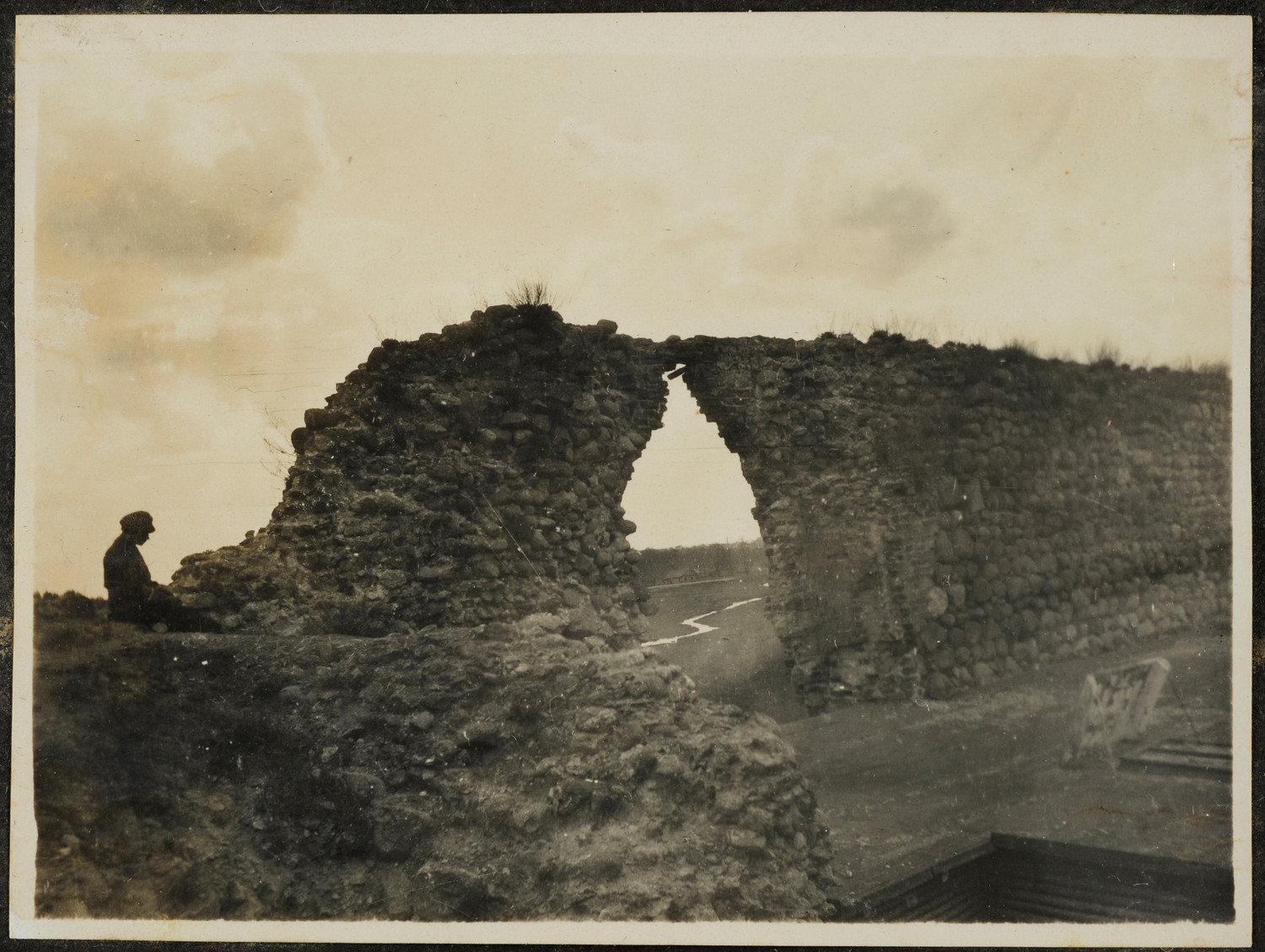 Nazwa: Żołnierz przy murze zamku, Krewo, data: 1919, miejsce: , typ obiektu: , wymiary7,8 x 10,4, opis: Mur kamienny z dziurą, fragment ruin zamku Olgierda w Krewo. Obok siedzi żołnierz Wojska Polskiego (?)