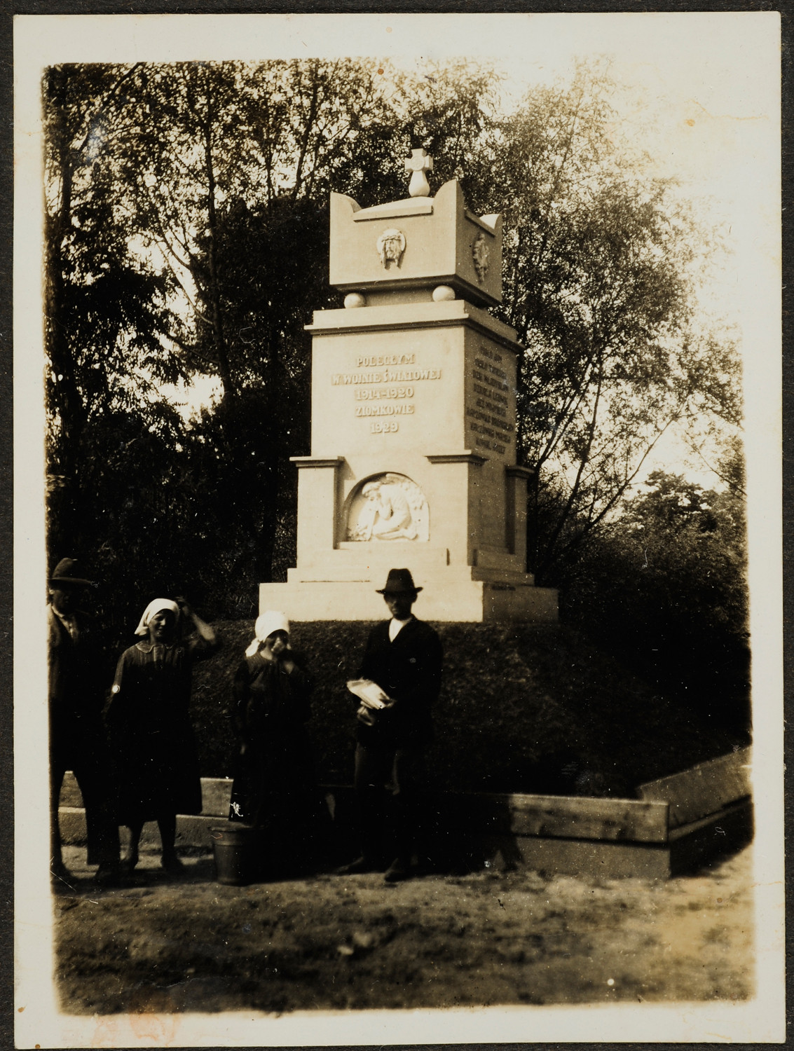 Nazwa: Grupa osób pod pomnikiem, data: l. 30 XX w., miejsce: , typ obiektu: , wymiary12,0 x 9,0, opis: Pomnik w kształcie prostopadłościennego monumentu z płaskorzeźbą w dolnej cżęści, tekstem inskrypcji w środkowej zwieńczony elementem w kształcie trumny z krzyżem.