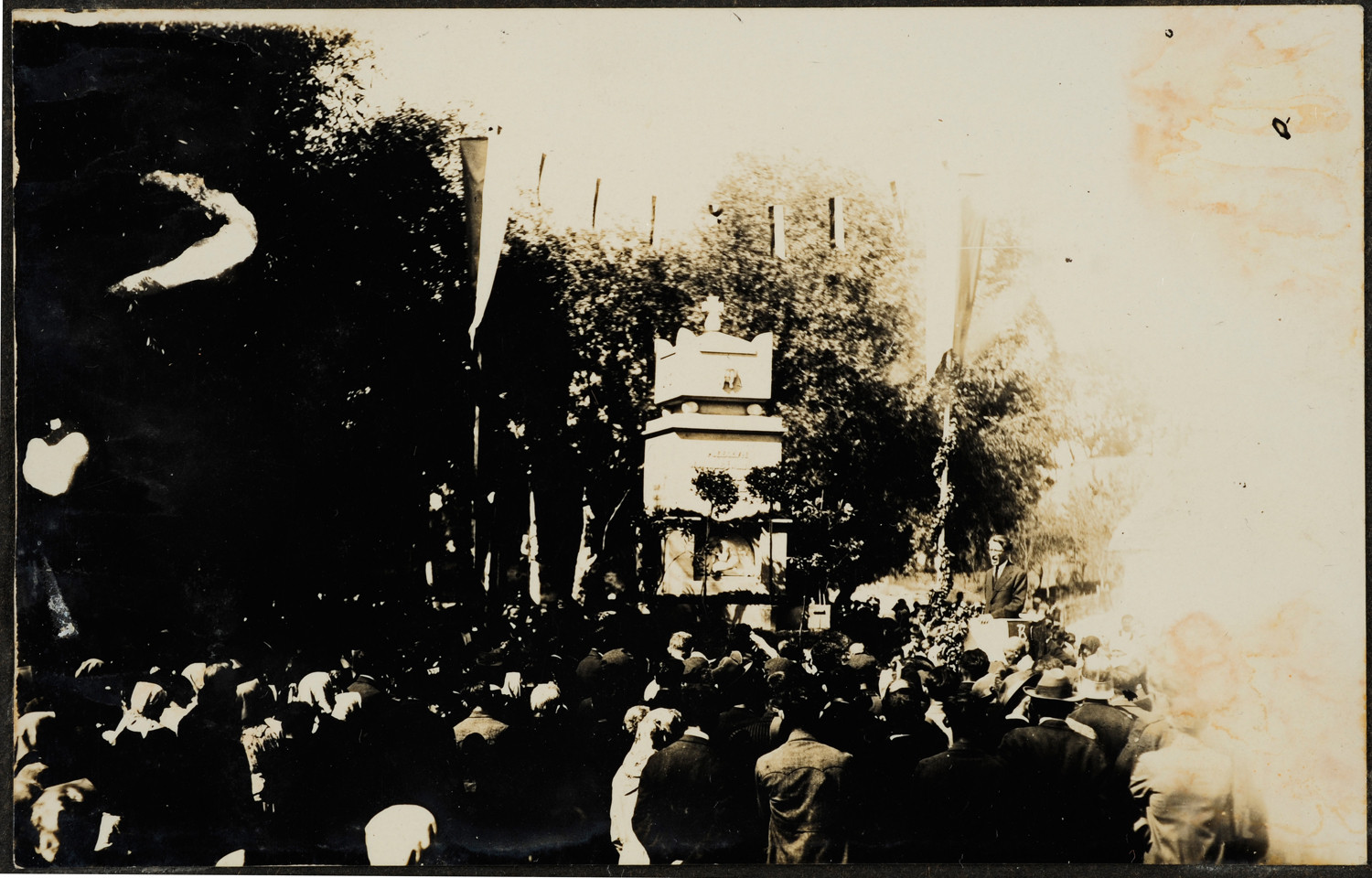 Nazwa: Manifestacja pod pomnikiem, data: l. 30 XX w., miejsce: , typ obiektu: , wymiary8,8 x 13,7, opis: Manifestacja ludności pod pomnikiem. Na mównicy przemawia mężczyzna.