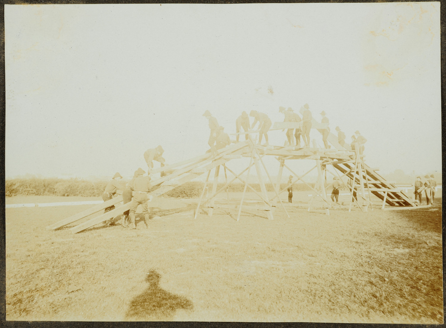 Nazwa: Grupa skautów, budowa rampy, data: pocz. XX w., miejsce: , typ obiektu: , wymiary8,3 x 11,2, opis: Końcowy etap budowy rampy. Drewniana konstrukcja wypełnia w całości kadr. Na rampie grupa skautów.