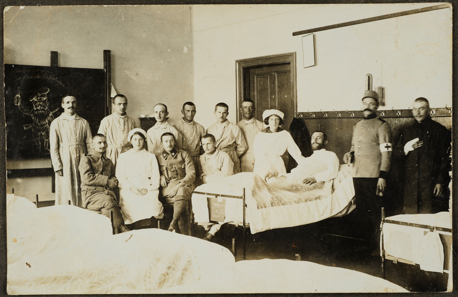 Nazwa: Grupa zołnierzy i oficerów austriackich w szpitalu, portret zbiorowy, data: I wojna swiatowa, miejsce: , typ obiektu: , wymiary8,6 x 13,7, opis: Grupa 14 osób: kobiety i mężczyźni, pozuje do fotografii w sali szpitalnej. Z lewej strony w dwóch rzędach chorzy i pielęgniarki, w centrum kadru chory na łużku w pozycji leżącej, po prawej żołnierz austryjacki - sanitariusz i chory.