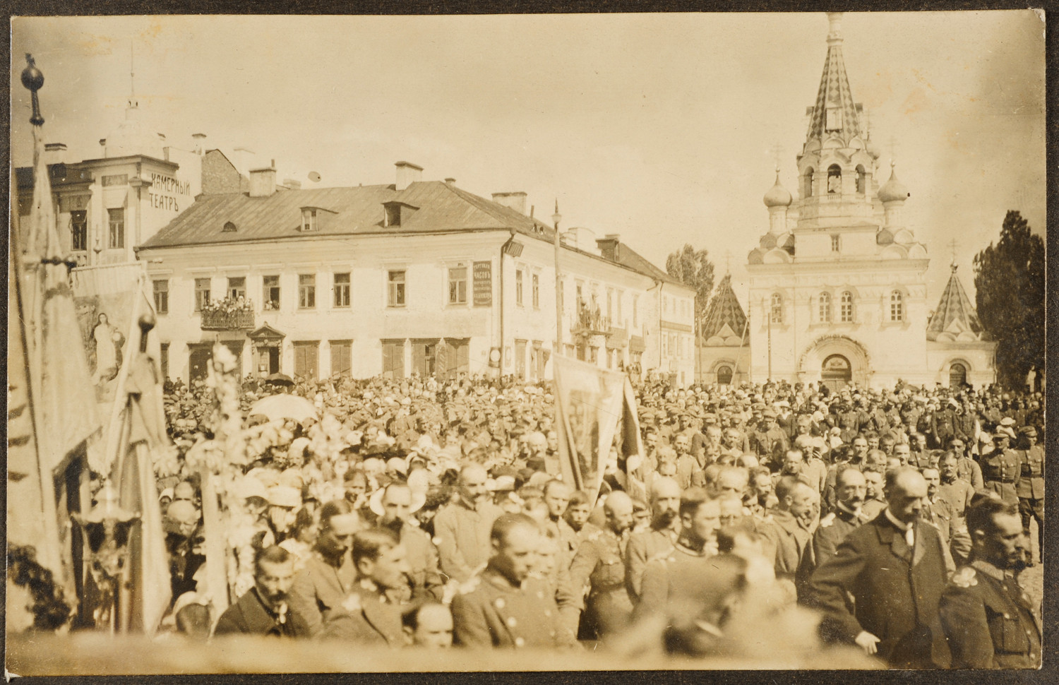 Nazwa: Uroczystości religijne., data: 1919.08, miejsce: , typ obiektu: , wymiary8,9 x 13,7, opis: Na placu przed bramą wejściową do soboru prawosławnego św. Ducha duża grupa osób cywilnych i wojskowych. Widoczne dwie chorągwie kościelne - katolickie.