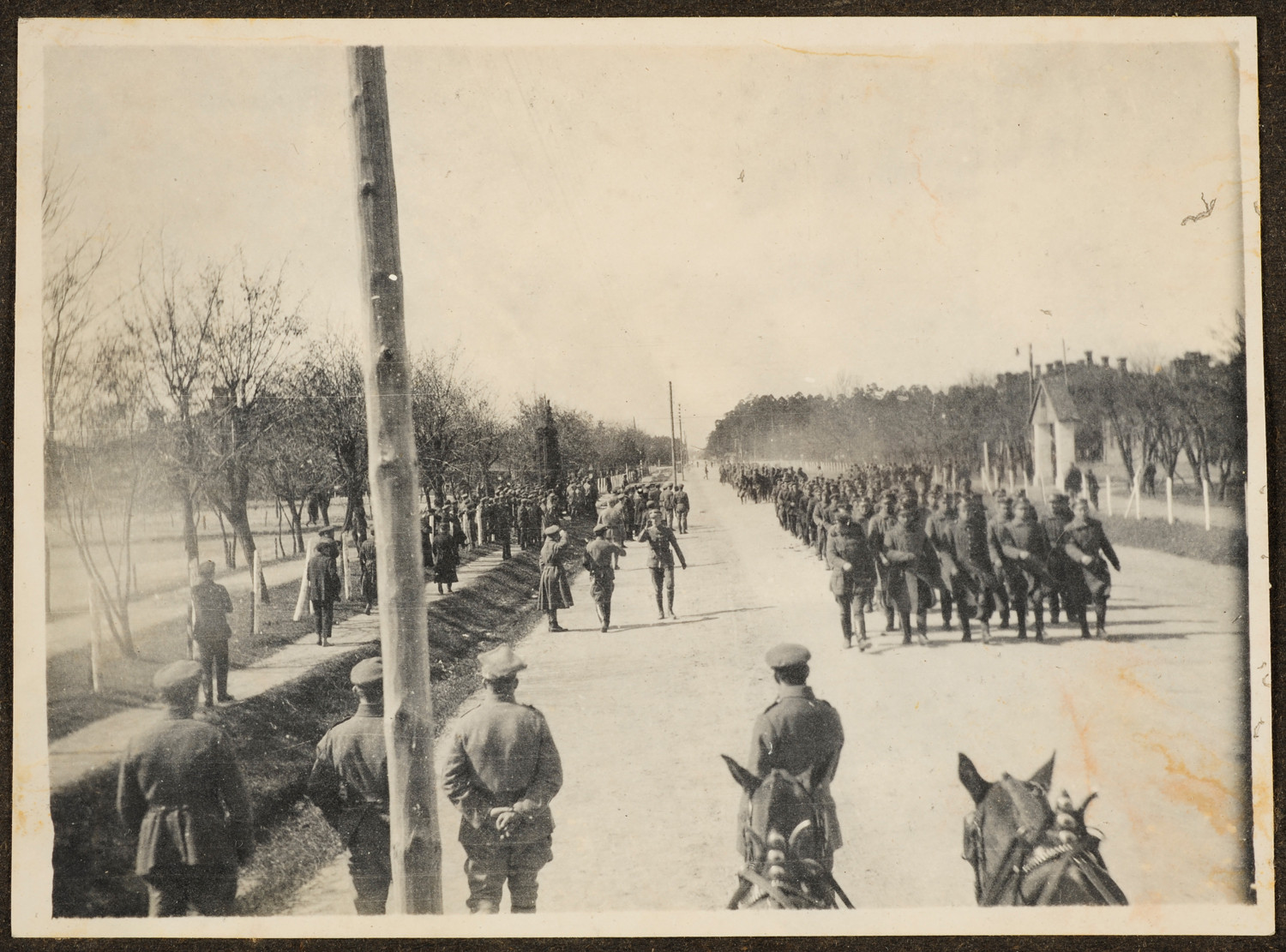 Nazwa: Przemarsz wojska, data: 1919, miejsce: , typ obiektu: , wymiary7,5 x 10,5, opis: Duża kolumna Wojska Polskiego maszeruje bita drogą.