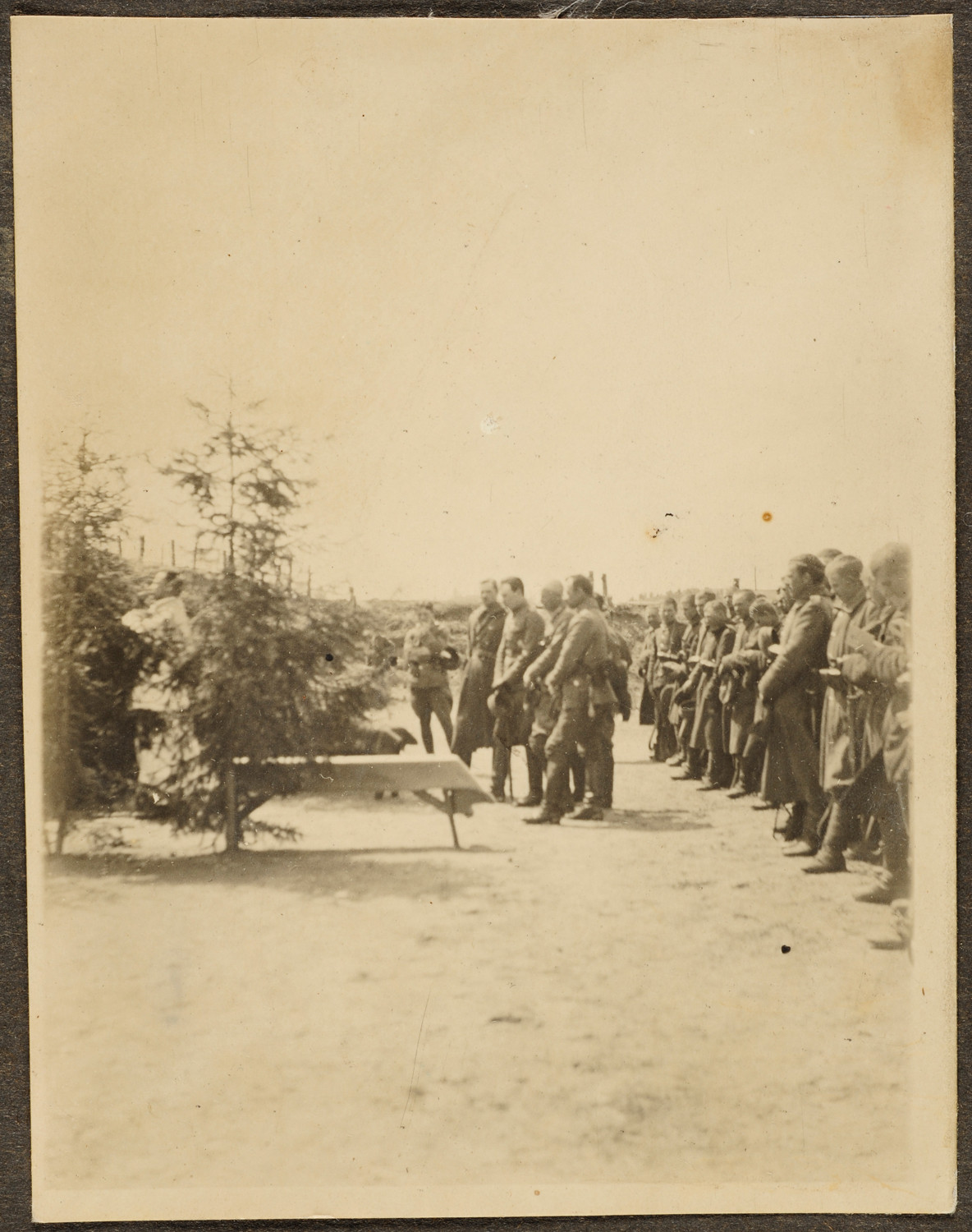 Nazwa: Msza Św. Polowa, data: 1919, miejsce: , typ obiektu: , wymiary8,5 x 11,0, opis: Grupa żołnierzy Wojska Polskiego uczestniczy w Mszy Św. Polowej. Przy ołtarzu widoczny duchowny.