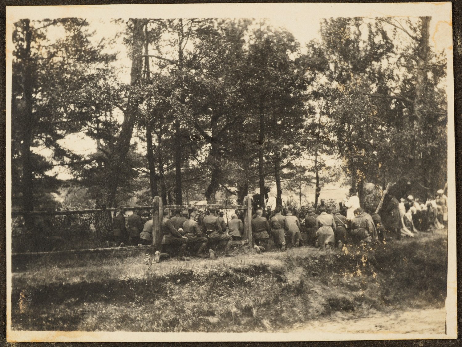 Nazwa: Msza św. polowa., data: 1919, miejsce: , typ obiektu: , wymiary7,5 x 10,4, opis: W lesie odprawiana jest Msza Św. Polowa. Ujęcie momentu podniesienia. W tle, za zagajnikiem widoczne jezioro-staw.