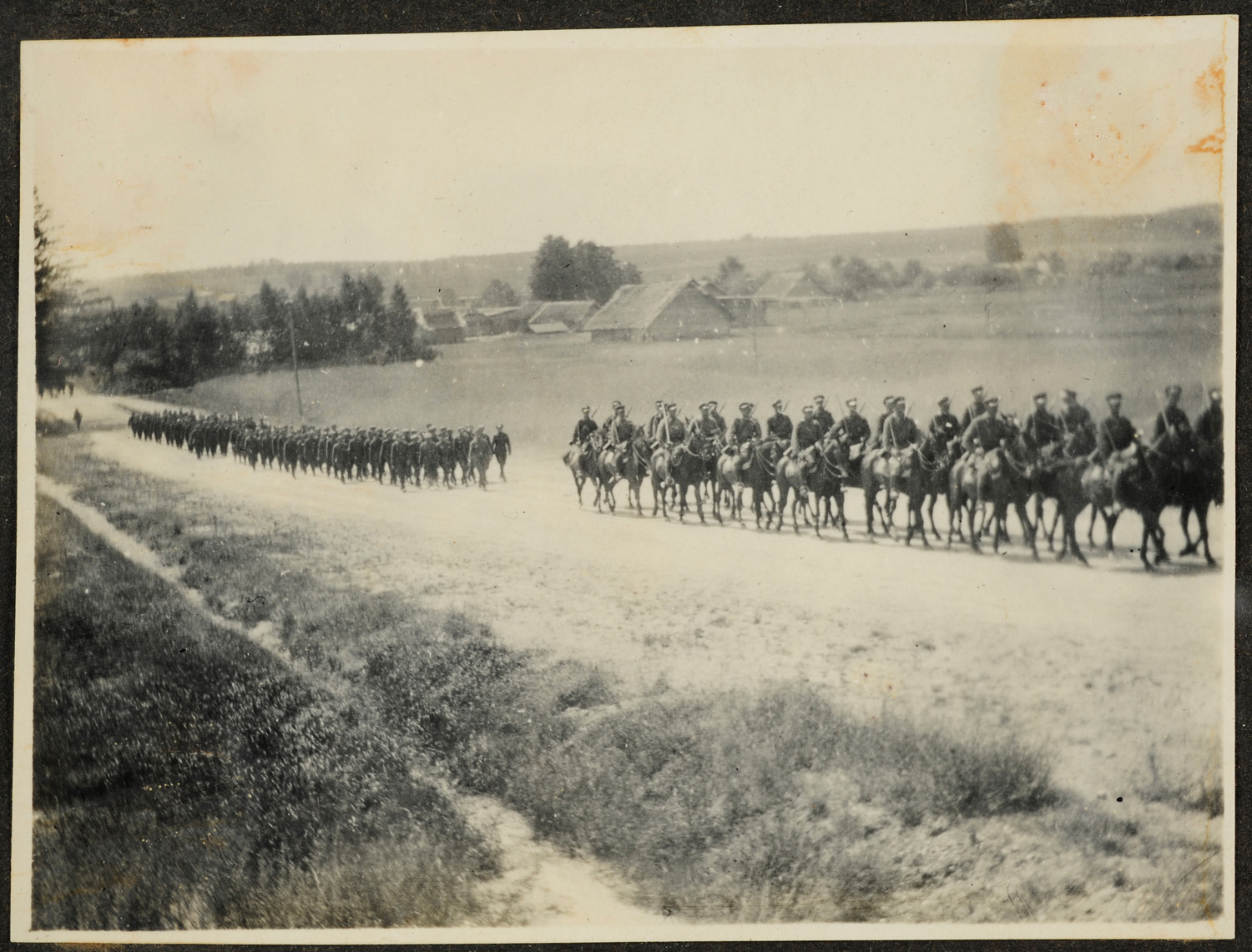 Nazwa: Przemarsz oddziału, data: 1919, miejsce: , typ obiektu: , wymiary7,2 x 9,6, opis: Drogą gruntową przemieszcza sie oddział Wojska Polskiego.