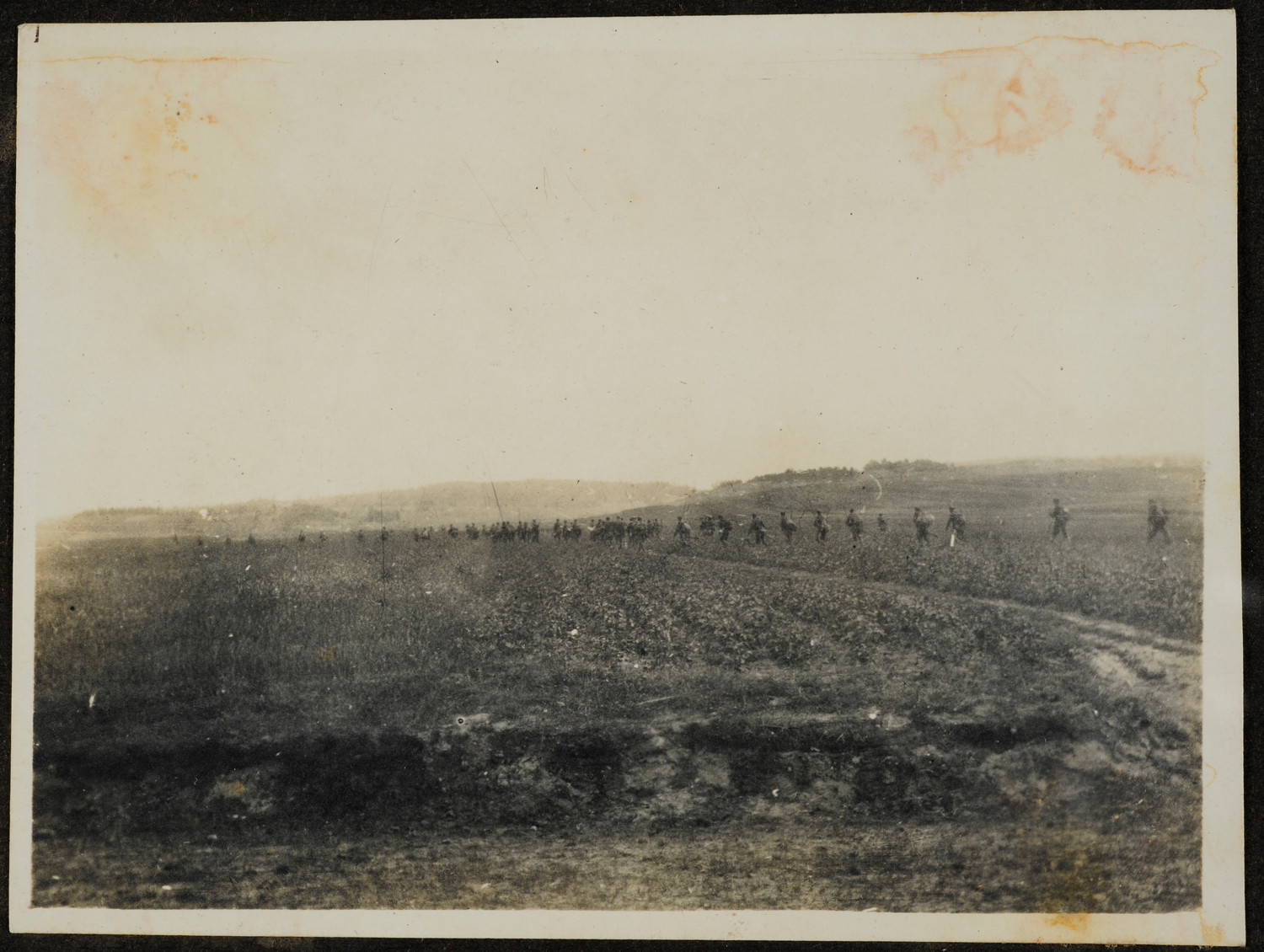 Nazwa: Oddział na polu, data: 1919, miejsce: , typ obiektu: , wymiary7,5 x 10,2, opis: Odział żołnierzy maszeruje w szeregu przez pole.