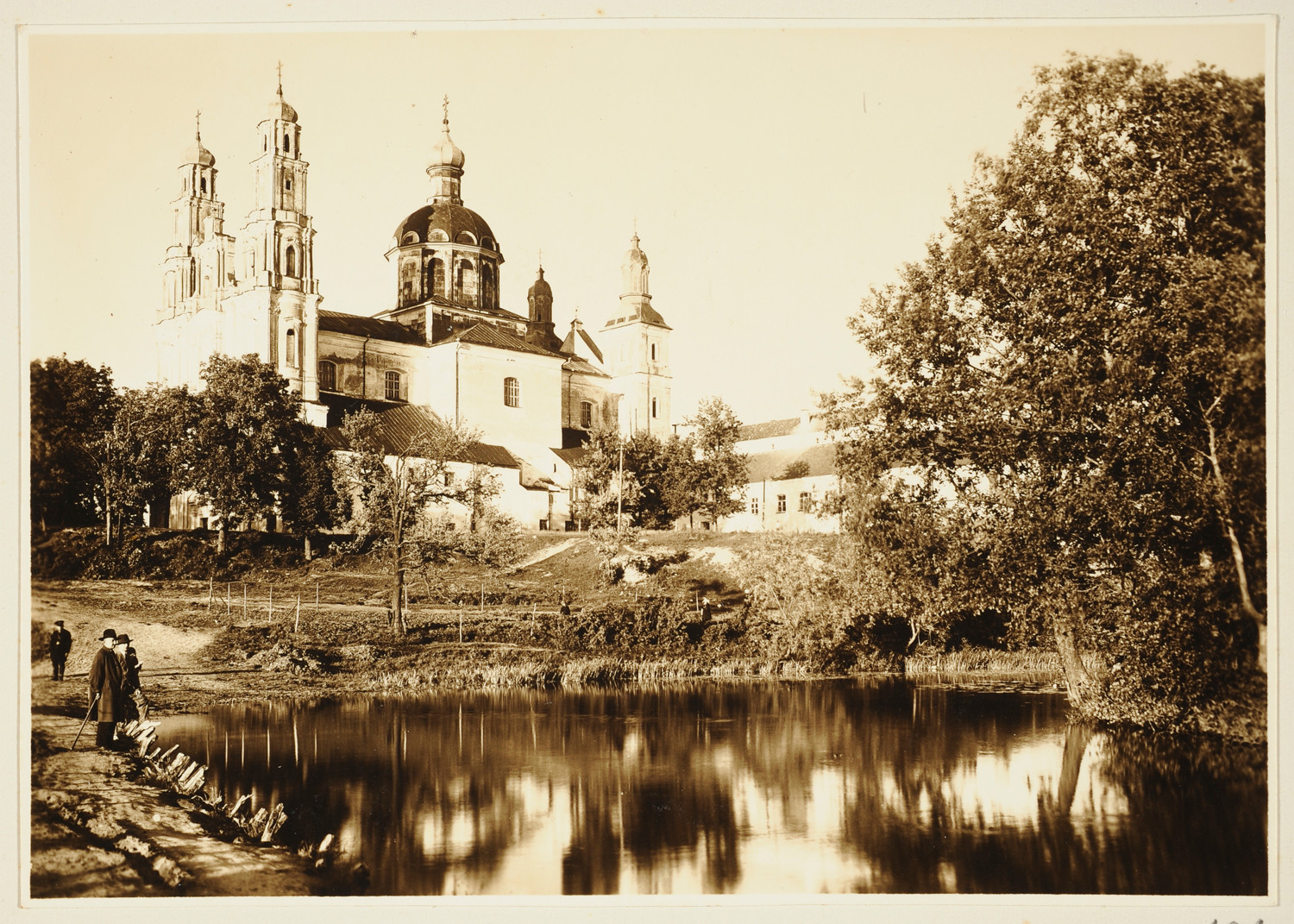 Nazwa: Sobór Narodzenia Najświętszej Marii Panny w Głębokiem, data: do 1930, miejsce: , typ obiektu: , wymiary11.8 x 17.0, opis: Budowla w stylu bazyliki z krótkim transeptem i kopułą, w narożach cztery wieże. Fragment czworobocznej zabudowy klasztornej. na pierwszym planie staw hodowlany.