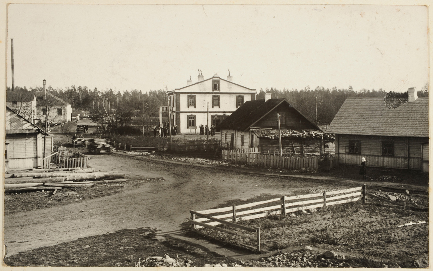 Nazwa: Papiernia w Rajówce, wizyta prezydenta Ignacego Mościckiego, data: 22 czerwca 1930, miejsce: , typ obiektu: , wymiary8.4 x 13.8, opis: Widok na obiekt przemysłowy, wg podpisu papiernia. Ciąg komunikacyjny, drogi gruntowe na pierwszym planie. Po obu stronach dróg parterowe budynki mieszkalne. W dalszej perspektywie murowany, piętrowy budynek o charakterze przemysłowym.