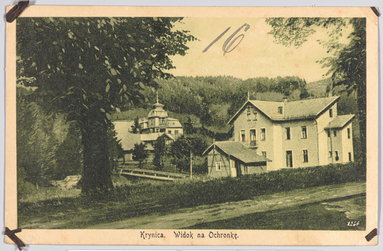 Nazwa: Krynica, widok na ochronkę;, data: l. 20,30 XXw., miejsce: , typ obiektu: , wymiary13,5 x 9, opis: krajobraz z okolic uzdrowiska z widokiem na ohronkę;