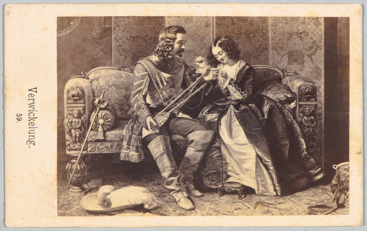 Nazwa: scena rodzajowa we wnętrzu, styliz. barokowa; reprodukcja fot. obrazu ol. (wg grafiki?), data: 2 poł. XIX w., miejsce: , typ obiektu: , wymiary9,5 x 6, opis: repr. fot. mal., młoda para we wnętrzu o styliz. barokowej; podpisy objaśn. druk.; na tekturce