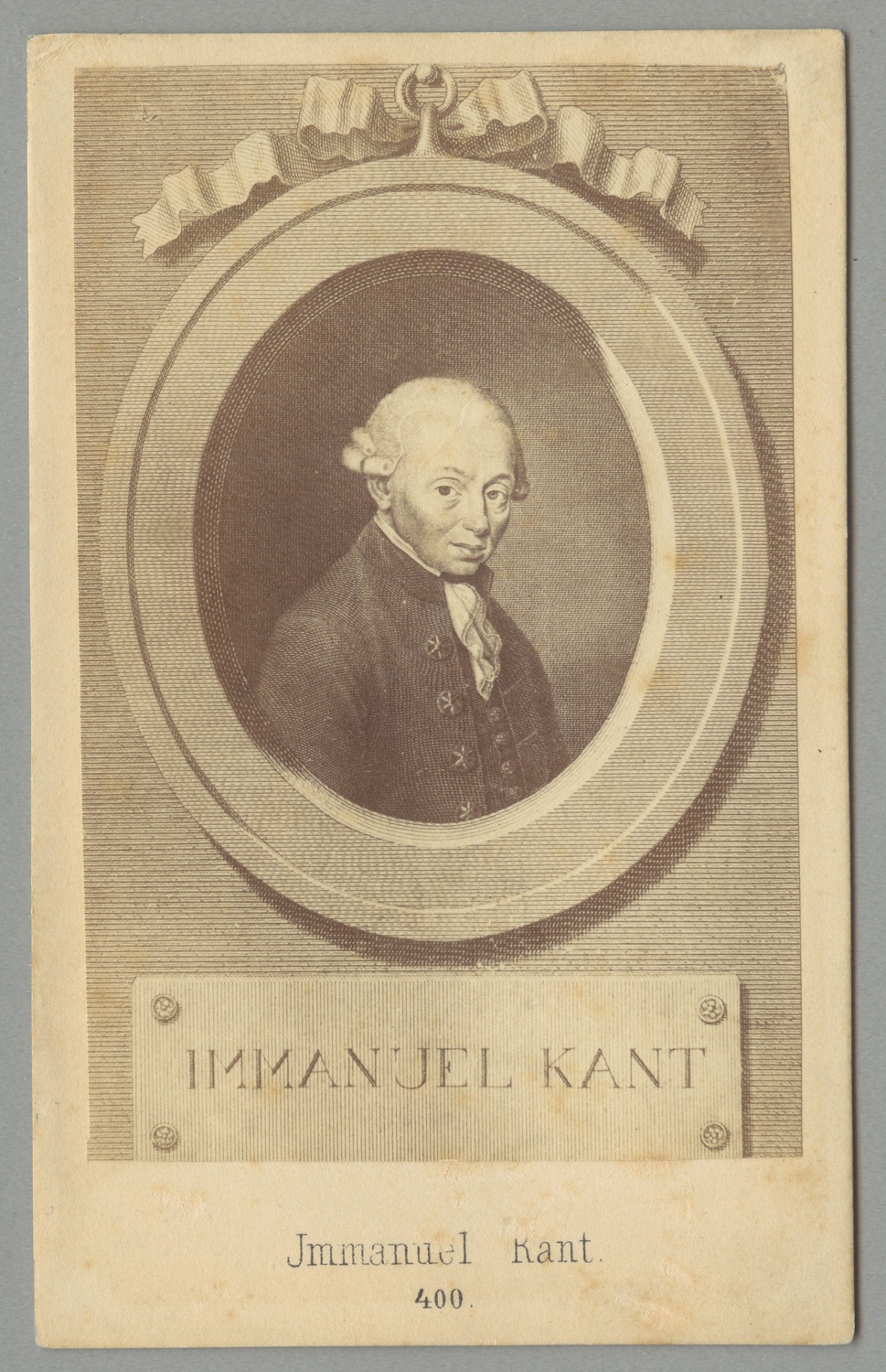 Nazwa: Immanuel Kant, portr., reprodukcja fot. grafiki, data: 2 poł. XIX w., miejsce: , typ obiektu: , wymiary10 x 6,2, opis: repr. fot. grafiki: rzeźb. portret I. Kanta popiersie w owalu., podpisy; na tekturce