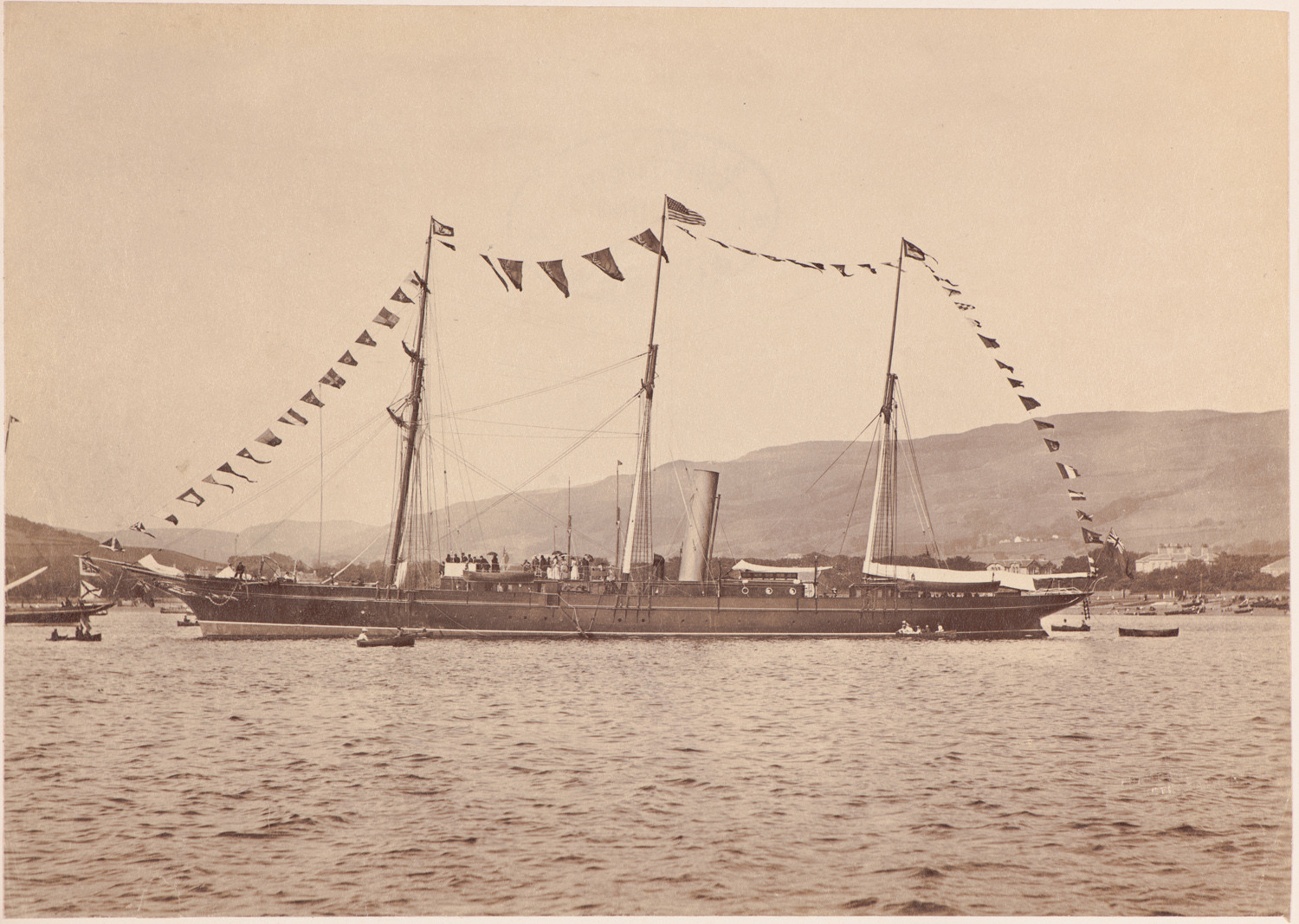 Nazwa: SY Mohican w gali flagowej., data: 1885 - 1900, miejsce: , typ obiektu: , wymiary20 x 28,3, opis: Akwen wodny; na pierwszym planie Mohican trzymasztowy szkuner gaflowy parowy; statek przybrany w paradę flagową; na topach masztów kolejno: flaga z przedstawieniem