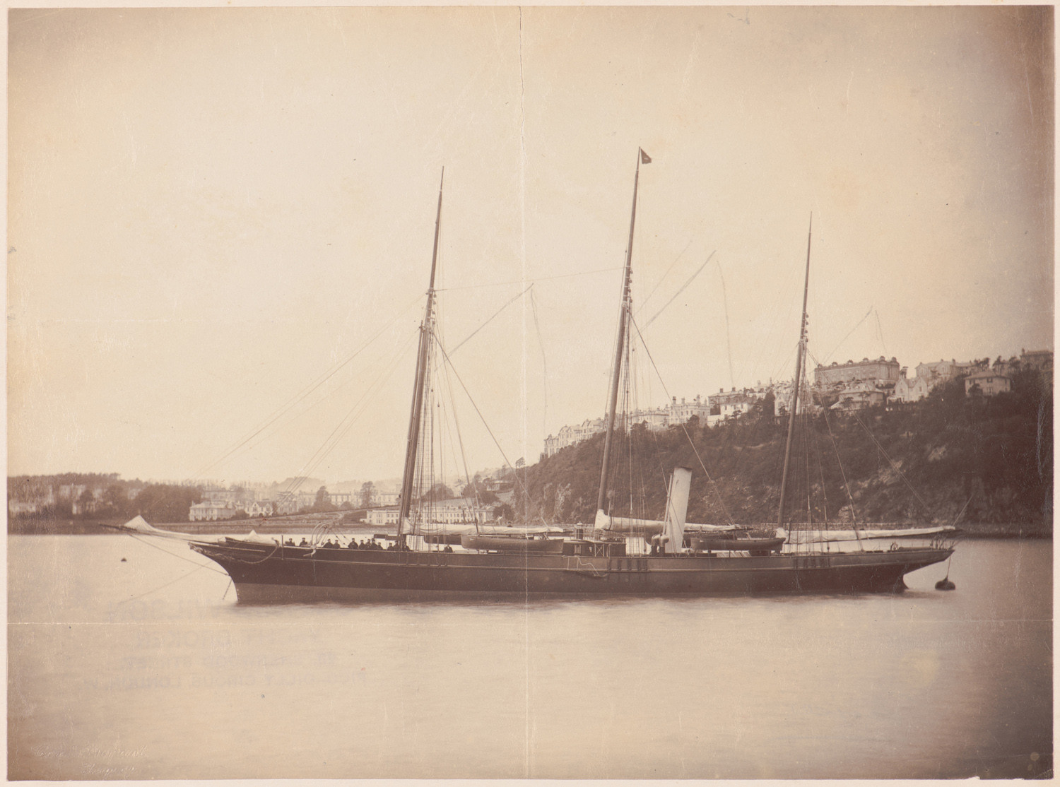 na redzie portu w Torquay., data: 1878 - 1893, miejsce: , typ obiektu: , wymiary18 x 24,3, opis: Port; statek trzymasztowy szkuner parowy stojący na redzie w porcie; widziany od lewej burty; dwukolorowy kadłub; na dziobie dekoracyjna wić; na topie drugiego