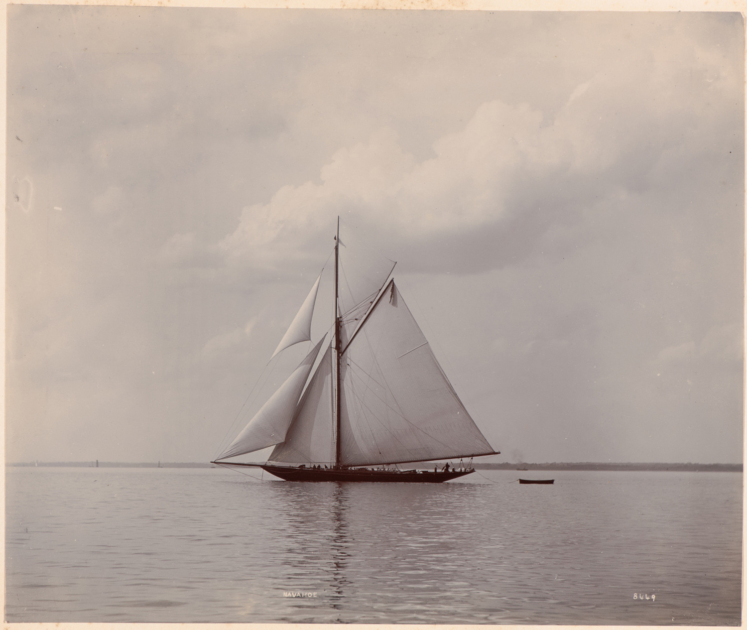 Nazwa: Navahoe płynie pod pełnymi żaglami przy bardzo delikatnym wietrze., data: l. 90. XIX w., miejsce: , typ obiektu: , wymiary23,3 x 27,9, opis: Akwen wodny; bardzo spokojna woda; na pierwszym planie Navahoe kuter gaflowy; widziany od lewej burty; ma rozwinięte prawie wszystkie żagle;